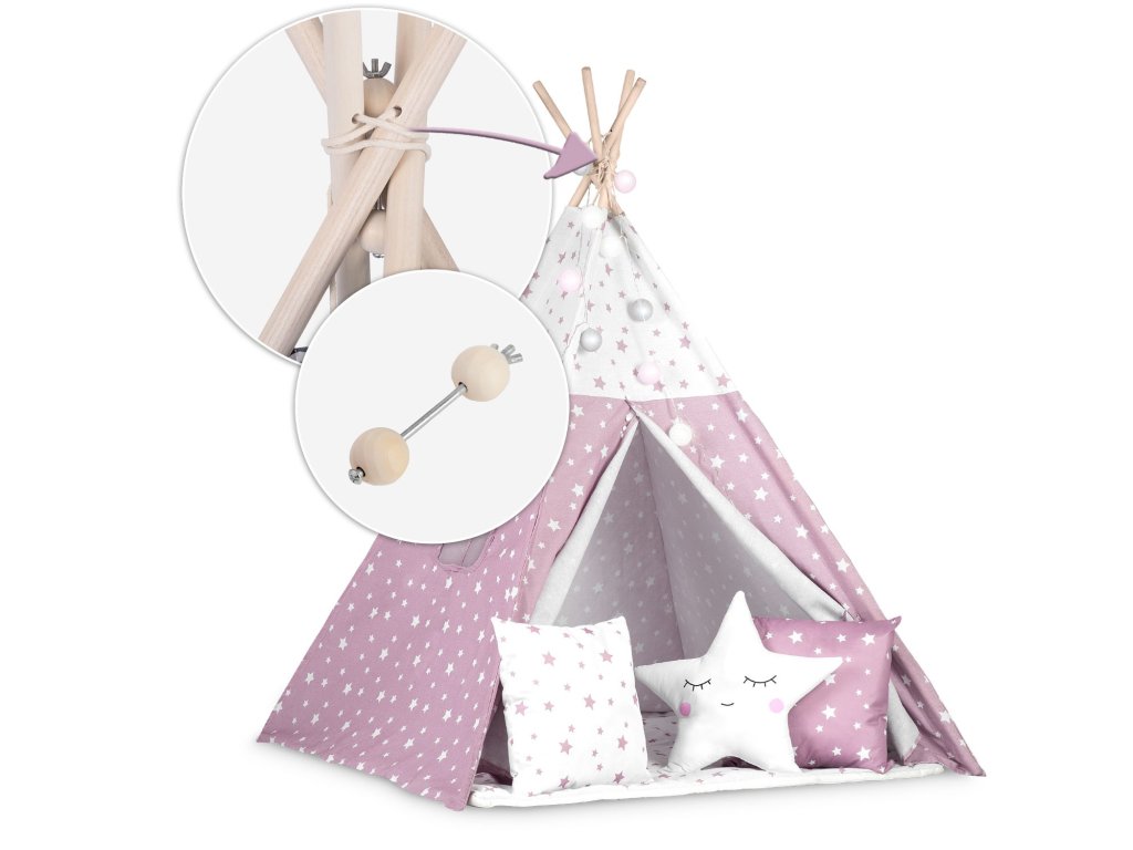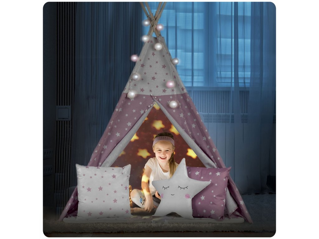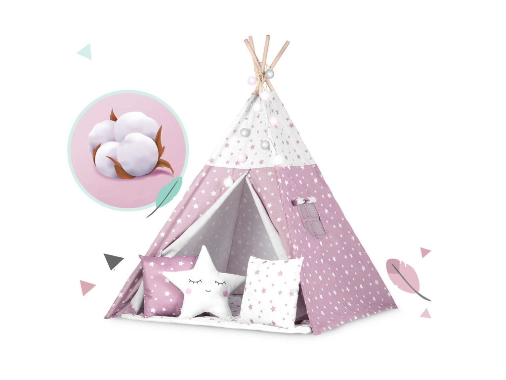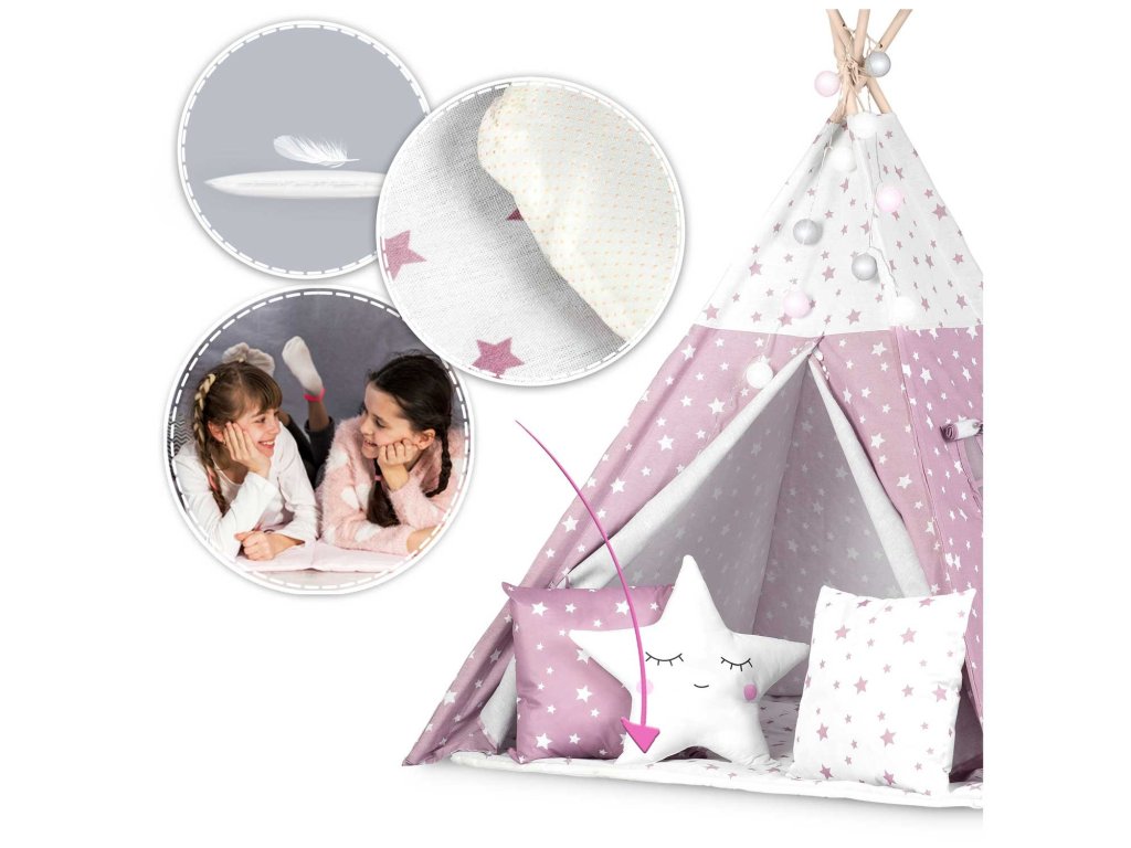 Aby bolo hranie ešte zábavnejšie, tipi sa dodáva s vankúše z kvalitnej bavlny a izolačná podložka s protišmykovými výstupkami.