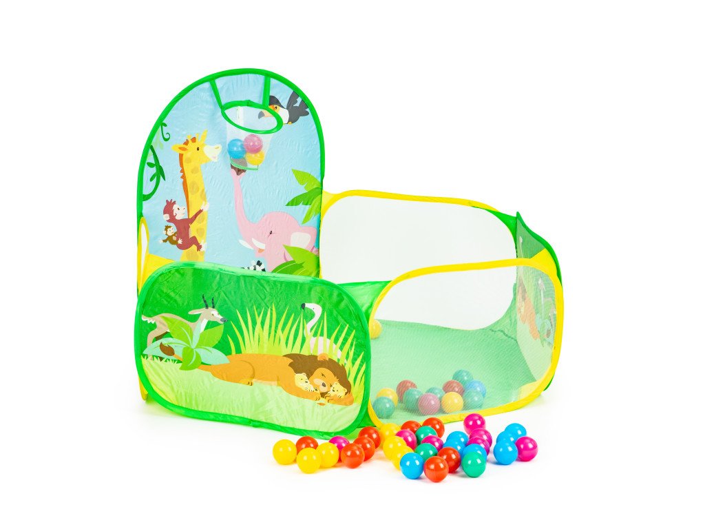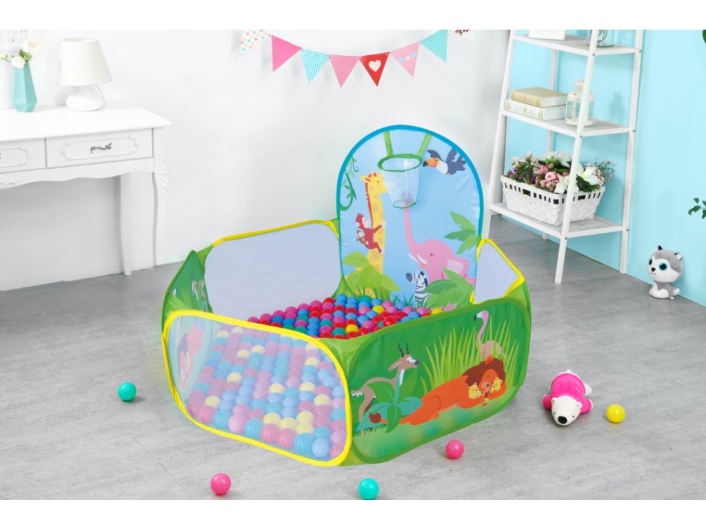 Súprava suchého bazéna obsahuje50 farebných loptičiek - bezpečné pre deti. Stan je praktický a ľahko sa skladá. Vďakavďaka ľahkému rámu sa ľahko prenáša z miesta na miesto.