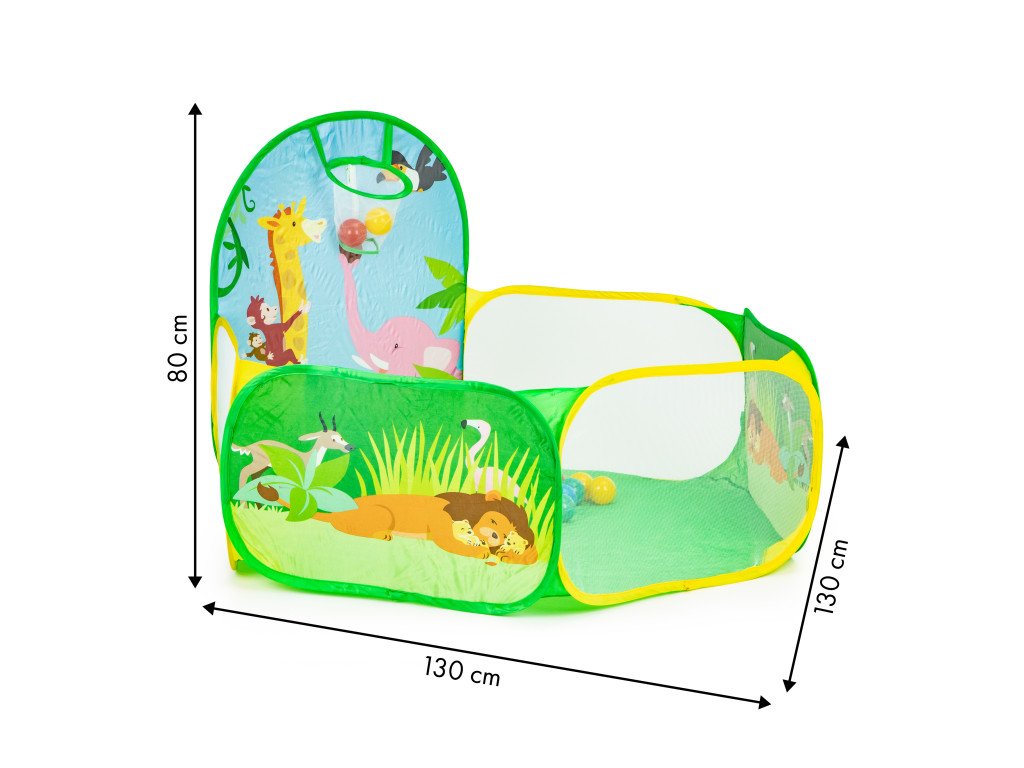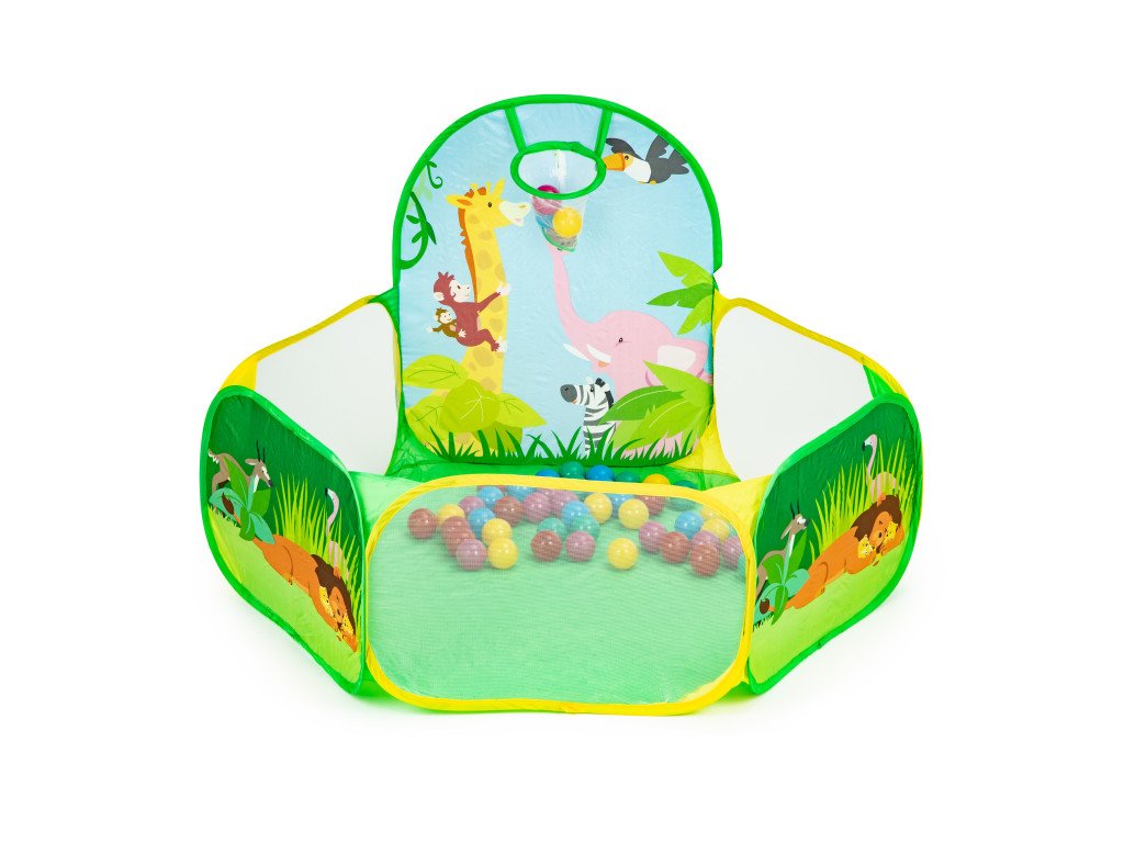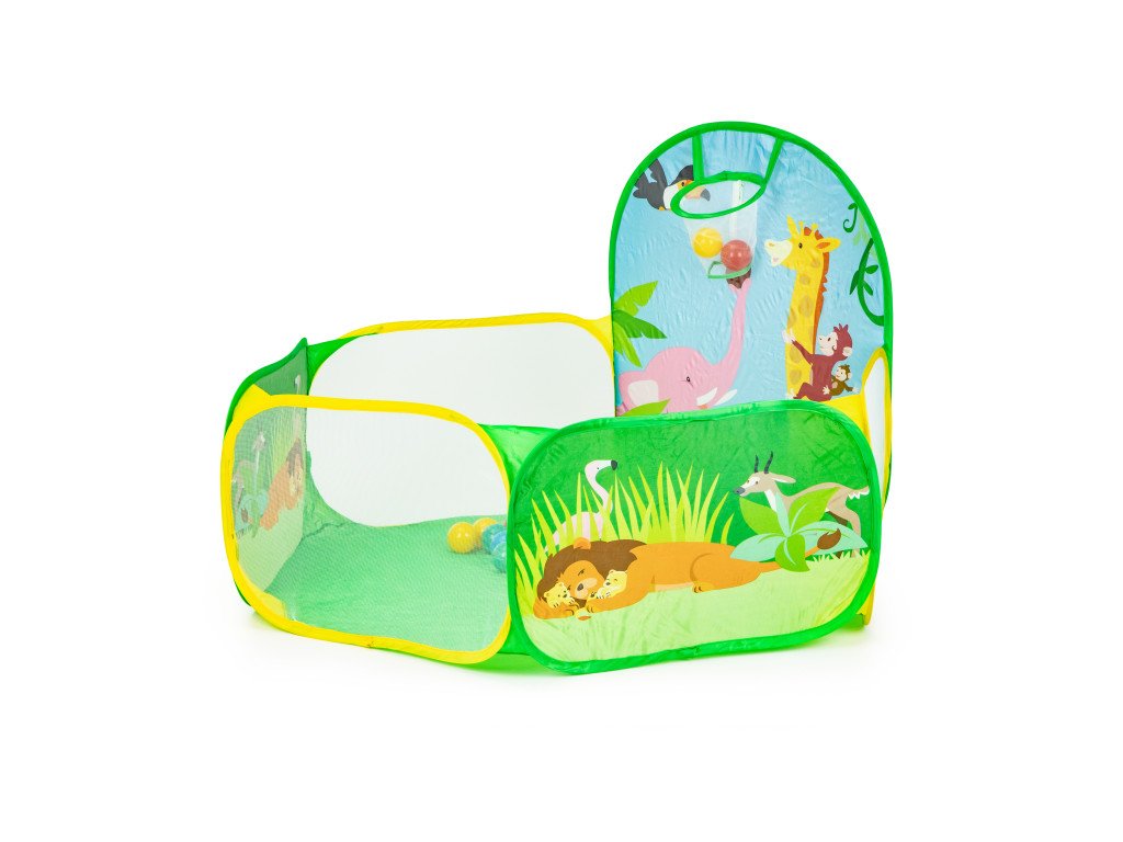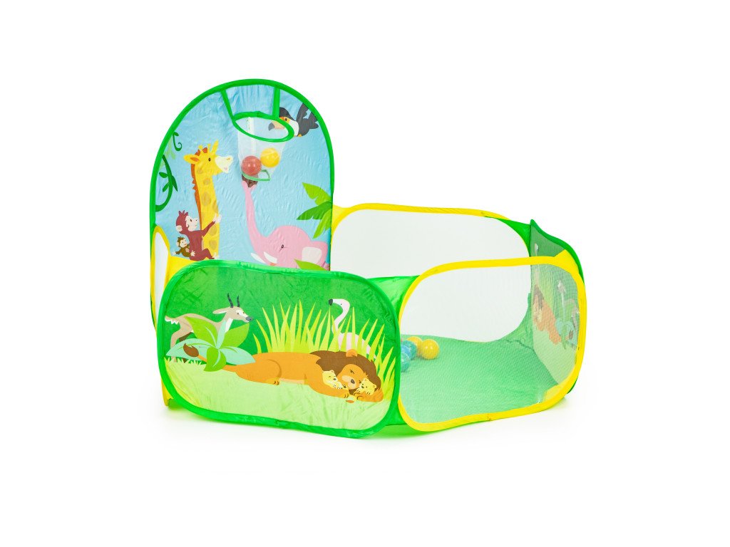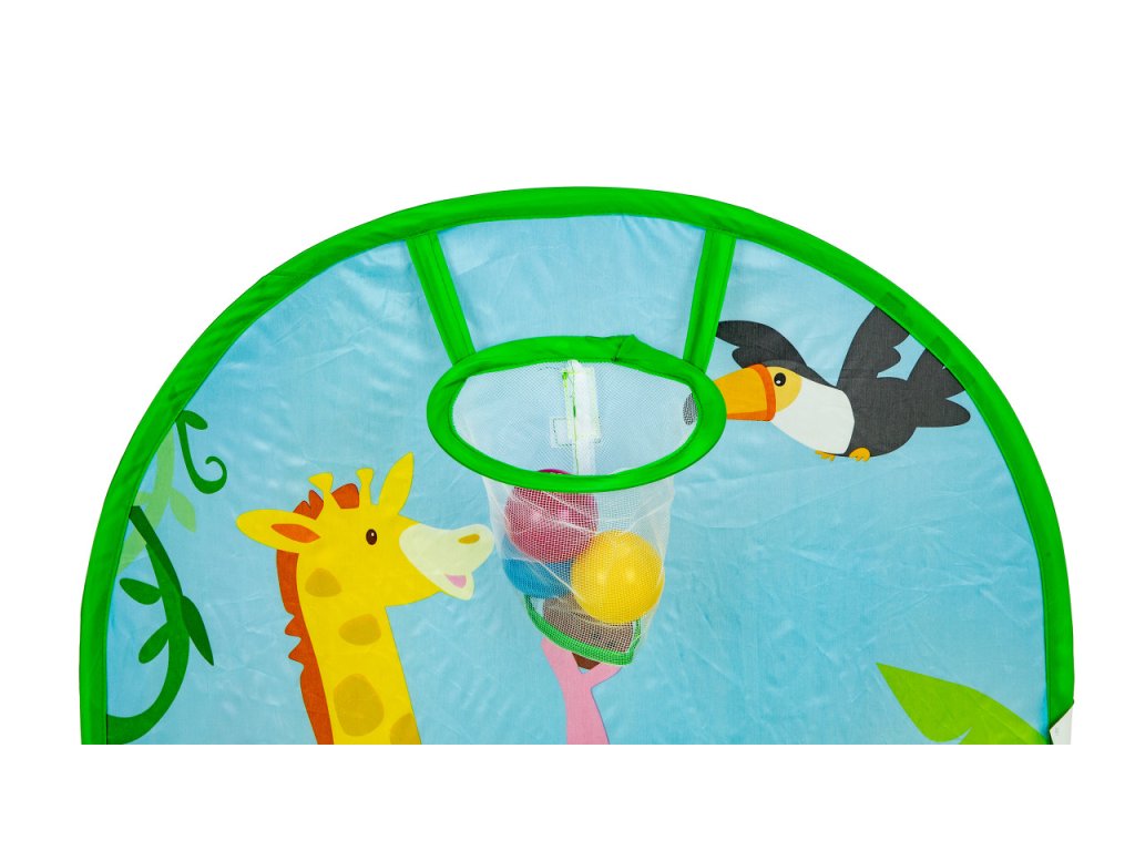 Stan sa skladá z rámu a poťahu z polyesterovej tkaniny, ktorý je popretkávaný priehľadnou sieťovinou, vďaka čomumôžete sledovať, ako sa vaše dieťa hrá. Na jednej zo stien bola namontovanákôš na hádzanie loptičiek.