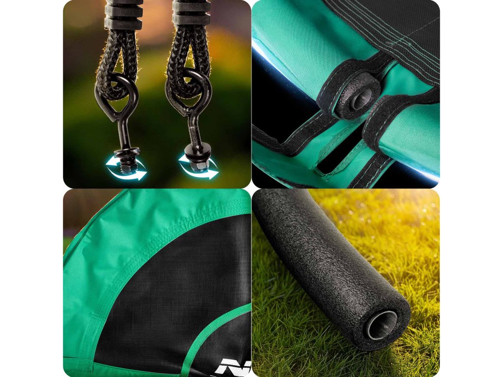 Hojdačka s oceľovým rámom pokryté mäkkou ochrannou penou, vyrobené z pevného materiálu s mnohonásobným prešívaním a na silných závesných lanách. Zaručuje bezpečnosť, stabilitu a odolnosť.
