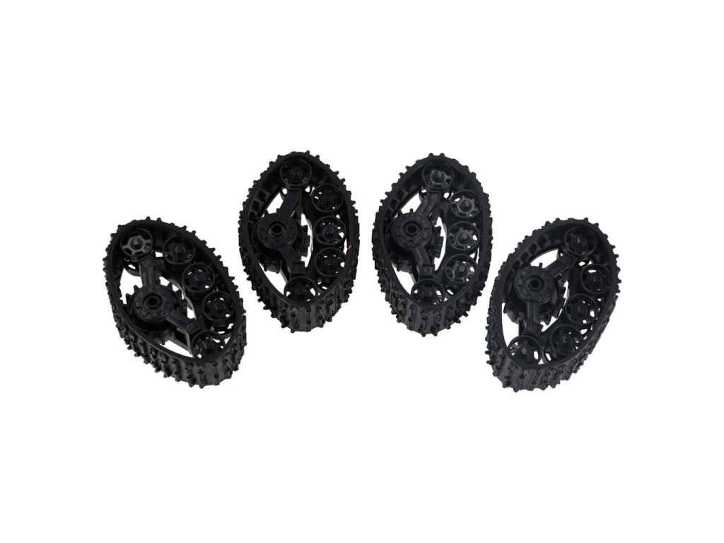 Vozidlo má gumové pásy a gumové pneumatiky na jazdu na rôznych povrchoch.