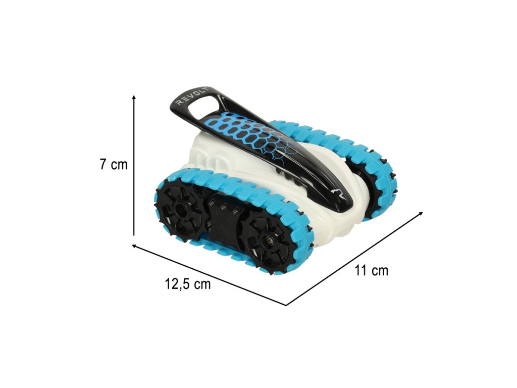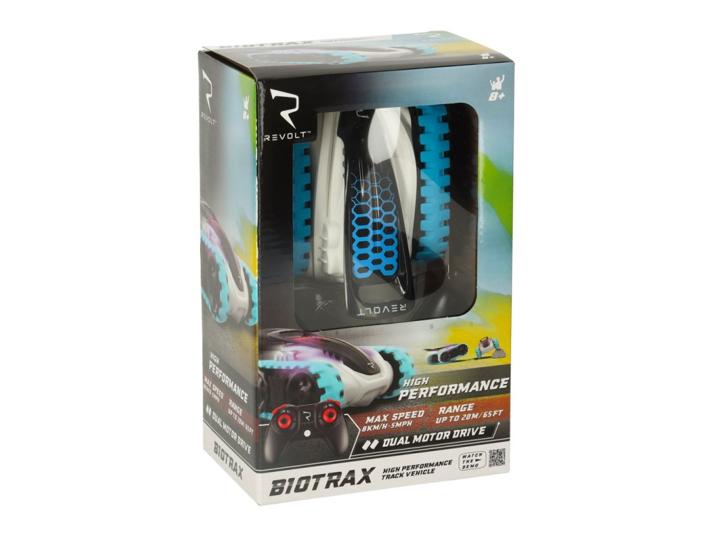 REVOLT BIOTRAX nie je obyčajné vozidlo na diaľkové ovládanie, ale futuristické terénne auto v miniatúrnom vyhotovení! Vďaka robustnej konštrukcii a pásovému podvozku zvládne auto akékoľvek podmienky. Či už je to miestnosť pokrytá kobercom, alebo dvor plný trávy, REVOLT BIOTRAX prejde po akomkoľvek povrchu!