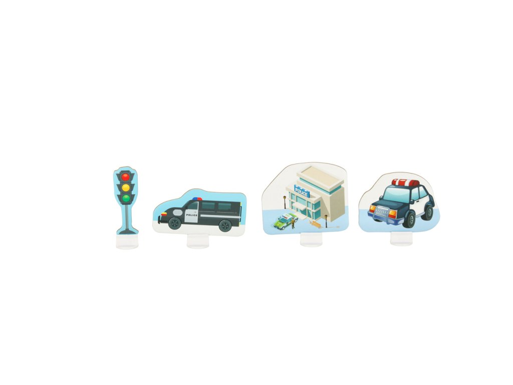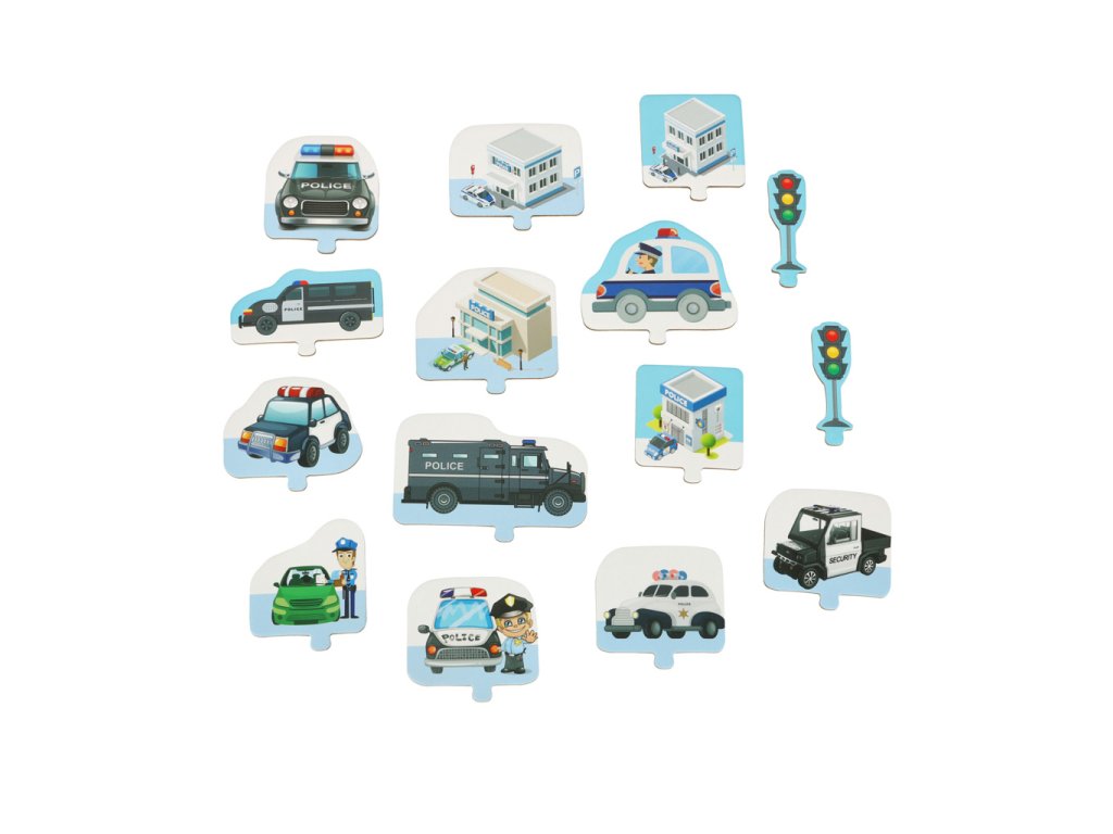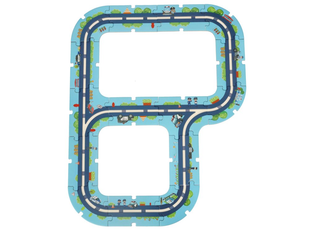 Tridsaťosem skladačiek umožňuje postaviť si vlastné mesto plné kľukatých ulíc, po ktorých bude môcť vaše batoľa jazdiť policajným autom, hliadkovať nad bezpečnosťou obyvateľov a reagovať na hlásenia.