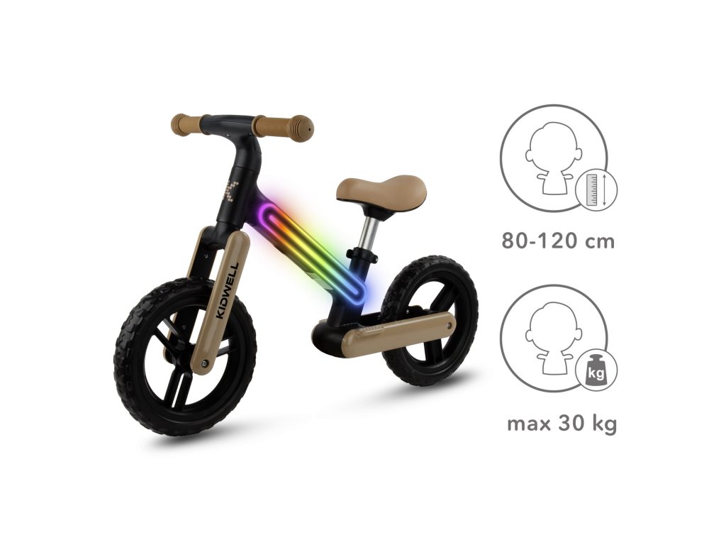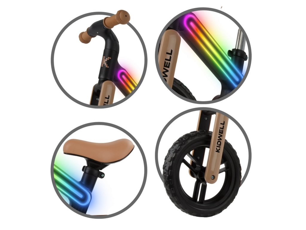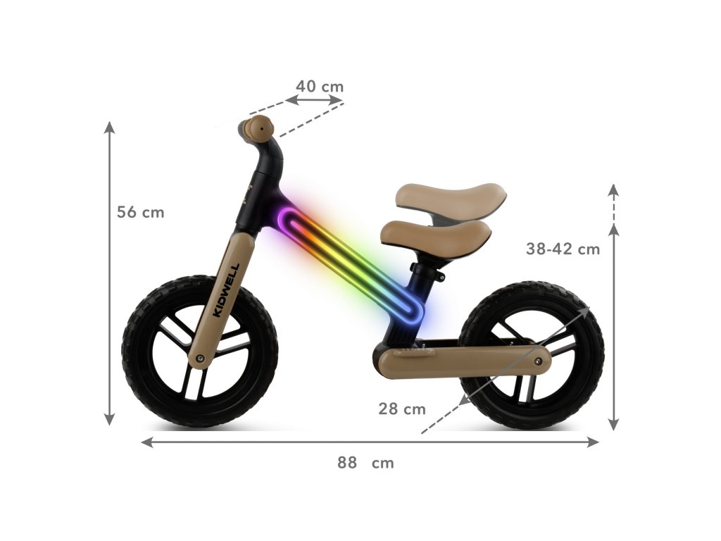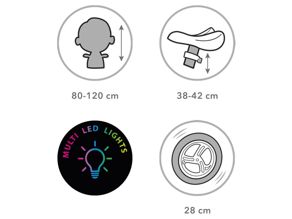 Jeho najväčšou prednosťou sú LED svetlá, vďaka ktorým bude dieťa dokonale viditeľné v nepriaznivom počasí a keď vonku zošedne a zábava je v plnom prúde. To výrazne zvýši bezpečnosť pri používaní. Má až 20 svetelných sekvencií. Rám je navyše vyrobený z veľmi odolného nylonu, používaného v priemysle na výrobu prvkov odolných voči zaťaženiu. Vaše dieťatko s hmotnosťou len 3,05 kg sa bez námahy naučí udržiavať rovnováhu a zlepší svoju motorickú koordináciu.