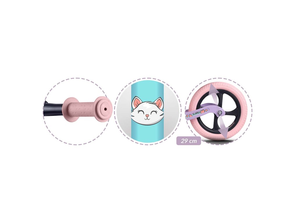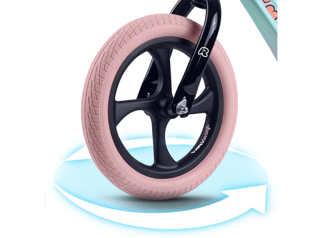 - Kolesá: veľké, robustné kolesá z peny EVA s pevnými pneumatikami pre stabilnú a plynulú jazdu. Vďaka tichej prevádzke je bicykel nerušivý pre ucho, a to aj pri jazde doma.