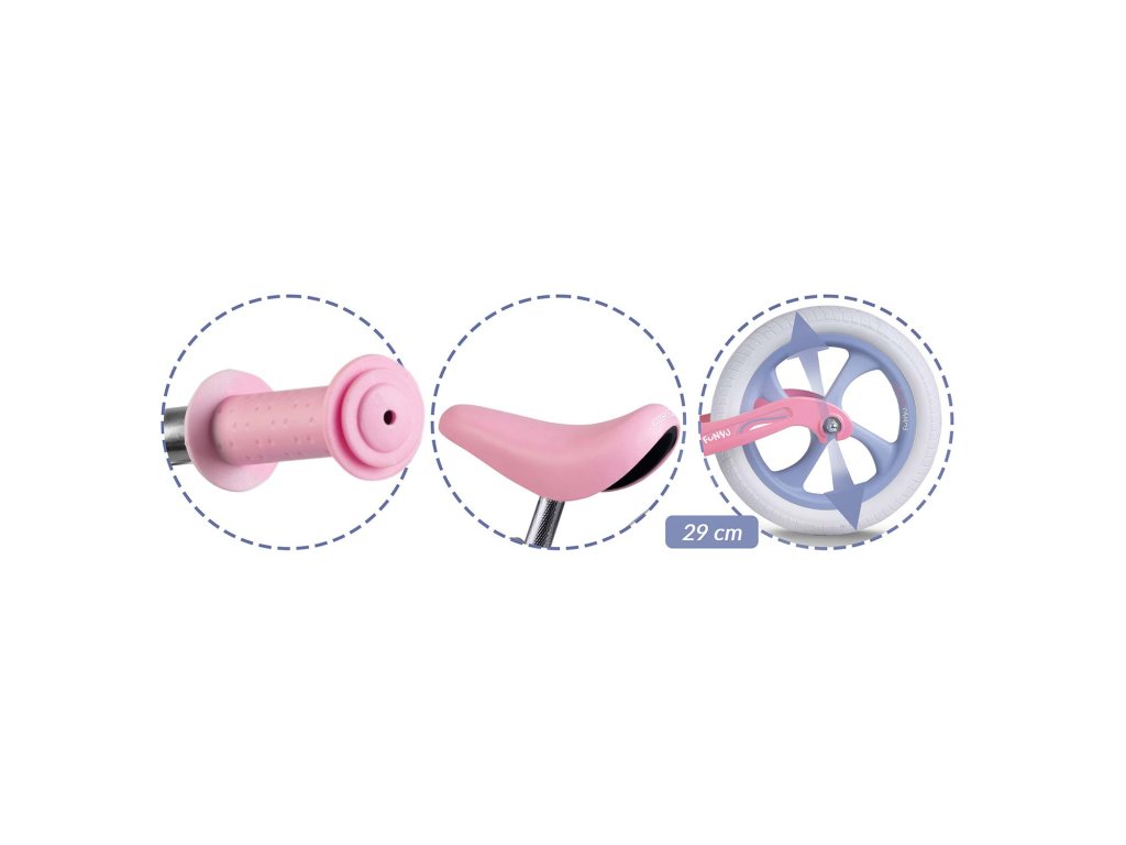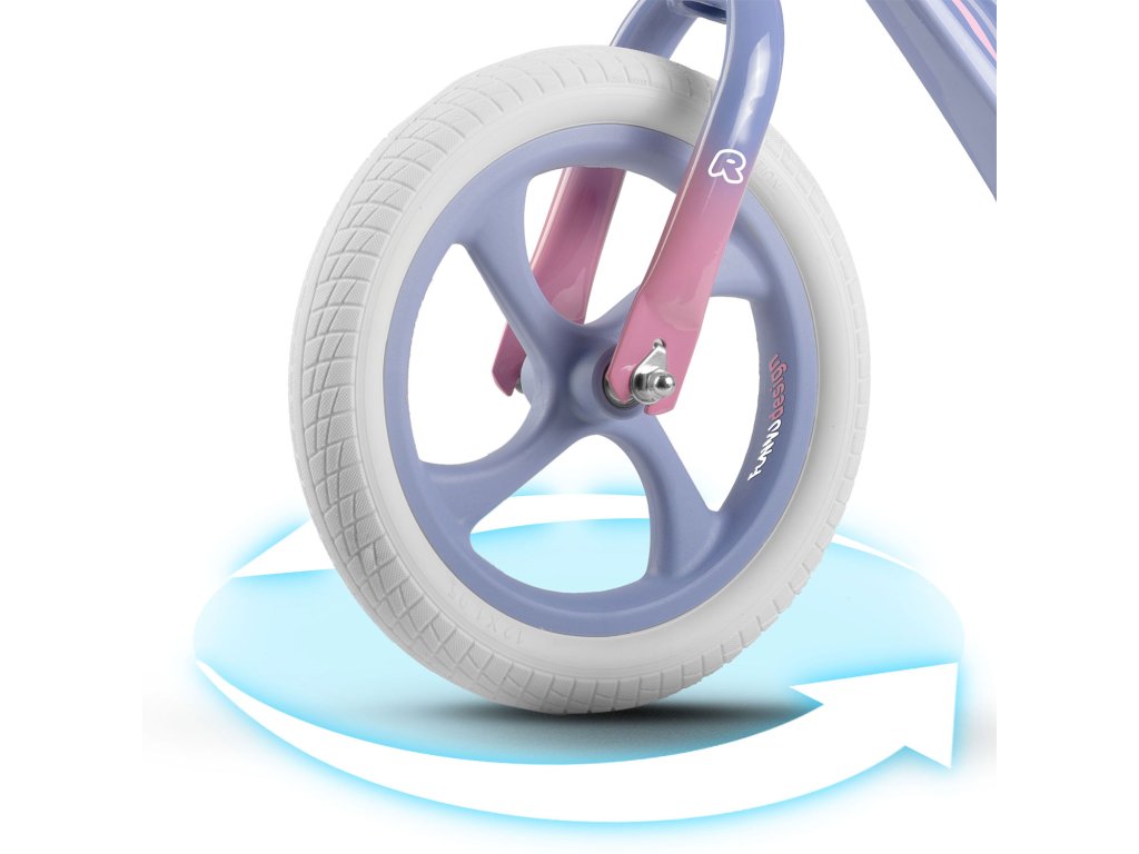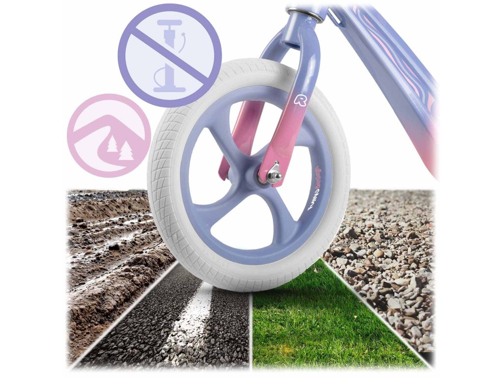- Kolesá: veľké, robustné kolesá z peny EVA s pevnými pneumatikami pre stabilnú a plynulú jazdu. Vďaka tichej prevádzke je bicykel nerušivý pre ucho, a to aj pri jazde doma.