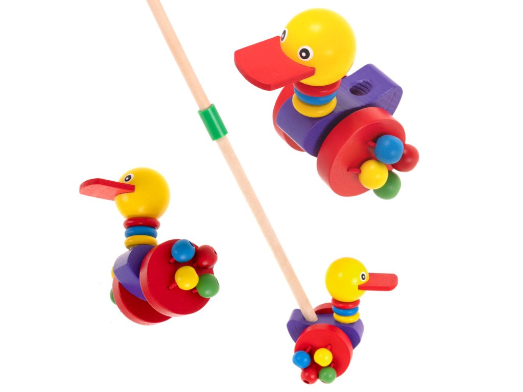 Drevená ťahacia kačička na paličke - chodítko pre deti s farebnými hrkajúcimi korálkami