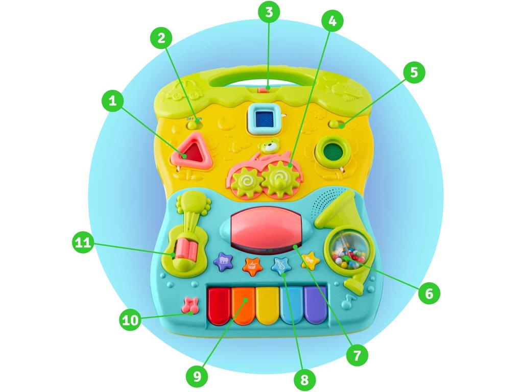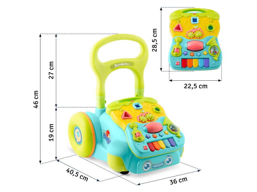 Okrem lekcie chôdze, výrobok je ideálny pre učenie sa farieb a tvarov. Odnímateľný panel (ak chcete panel odstrániť, stlačte tlačidlo v spodnej časti konštrukcie, čím uvoľníte zámok) možno použiť ako výučbovú tabuľu.