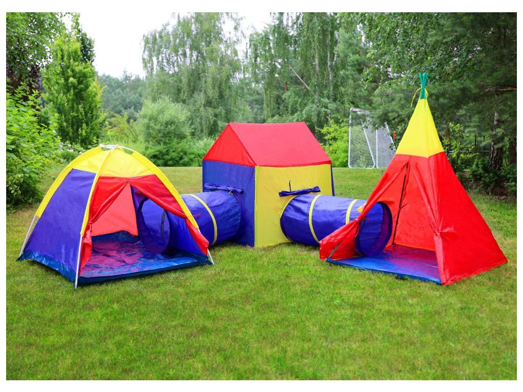 Súprava3 rôzne stany spojené do jedného veľkého ihriskaje ideálny spôsob, ako sa zabaviť na čerstvom vzduchu. Vďaka jeho univerzálnej konštrukcii je možné konfigurovať a kombinovať prvkyneobmedzené. Každá časť ihriska sa dá používať samostatne, takže jeideálny pre domácnosť aj záhradu.
