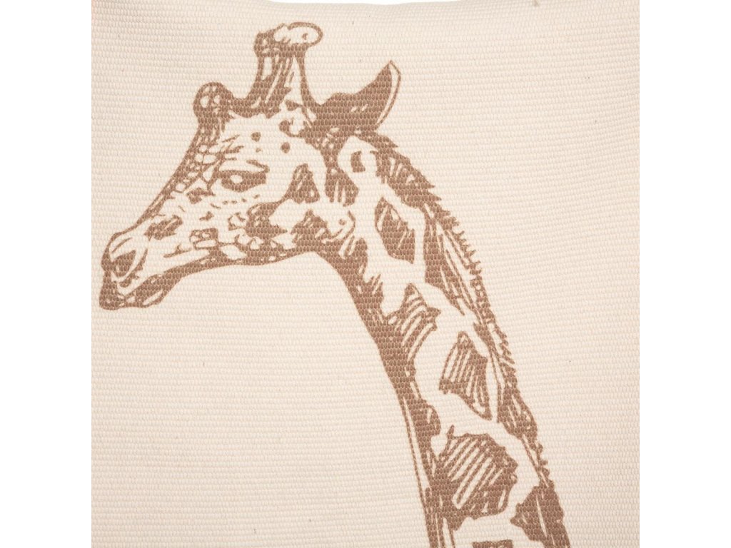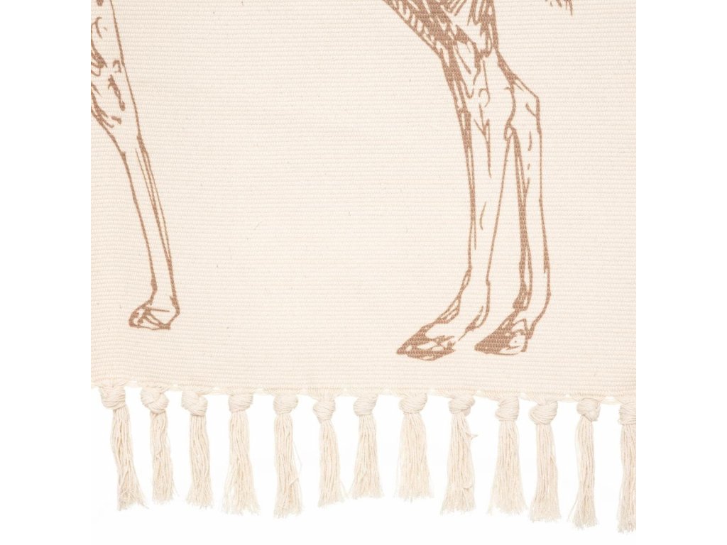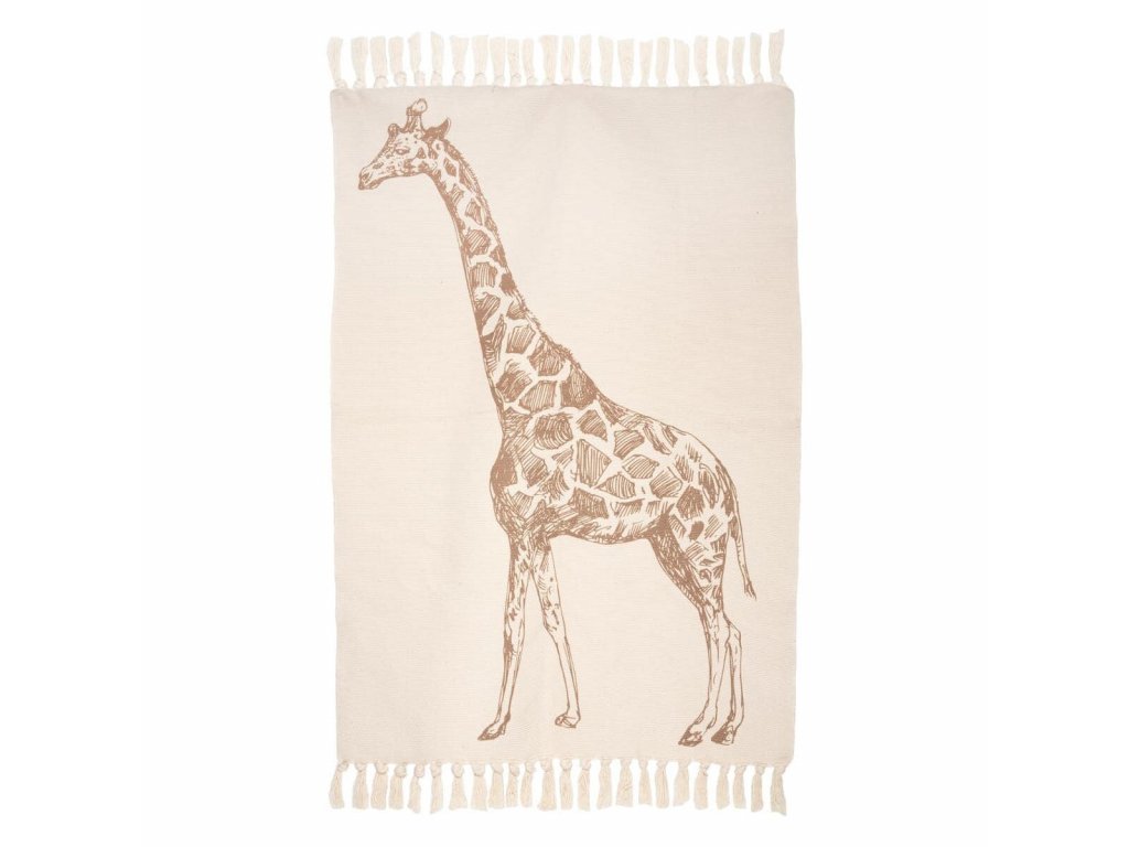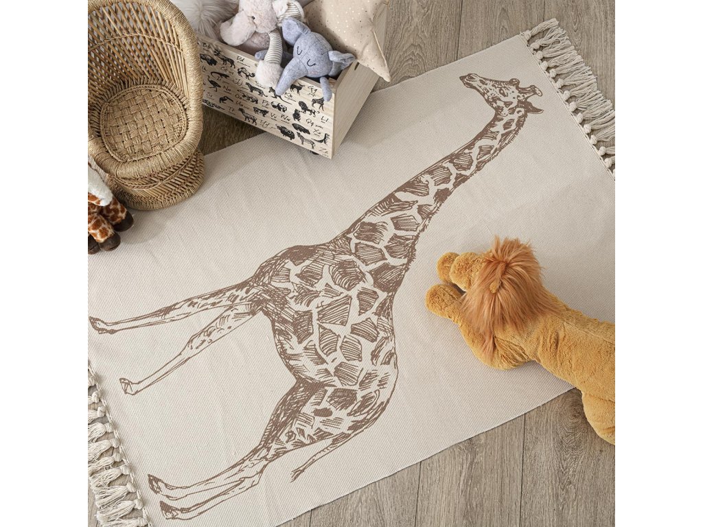 Tento tkaný koberec zo zmesi bavlny má obdĺžnikový tvar s okrajmi a brmbolcami a má hladké pozadie. Predstavuje žirafu.