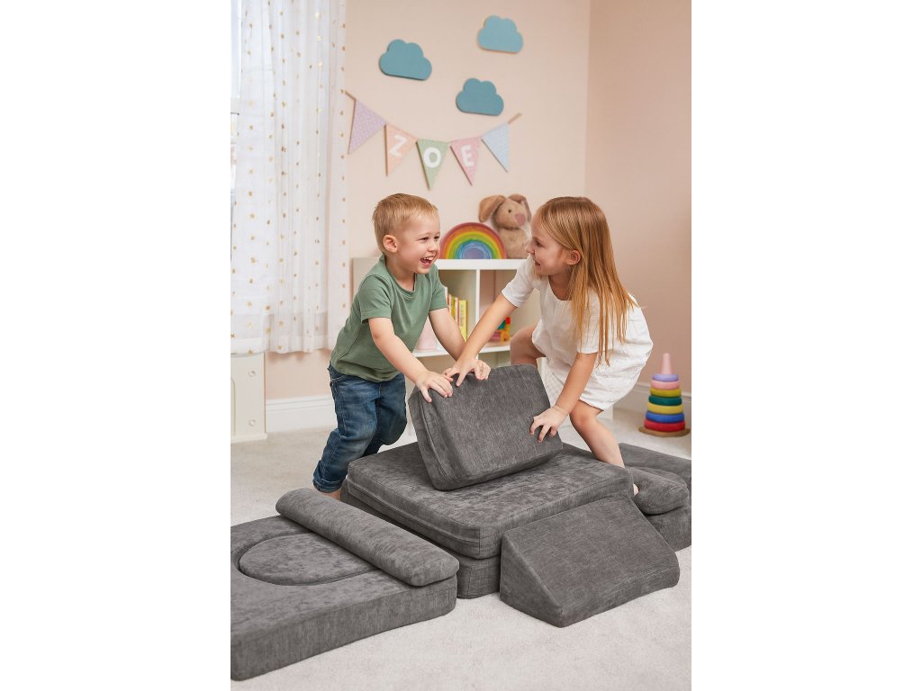 Modulárny dizajn a rôzne tvarované vankúše poskytujú deťomneobmedzené možnosti vytvárania rôznych štruktúr, vaše dieťa si tak môže postaviť dom, hrad alebo vozidlo z pohodlia pohovky. Tento druh hryzaručuje skvelú zábavu pre deti, mimochodomrozvíja ich predstavivosť a manuálne zručnosti.