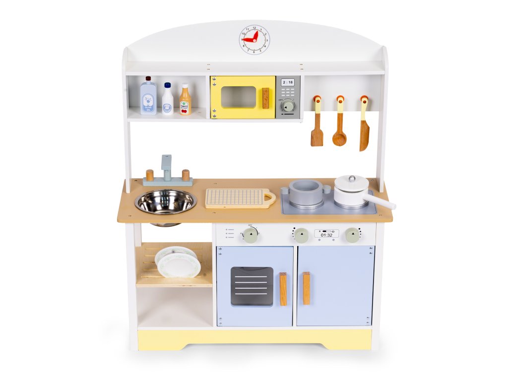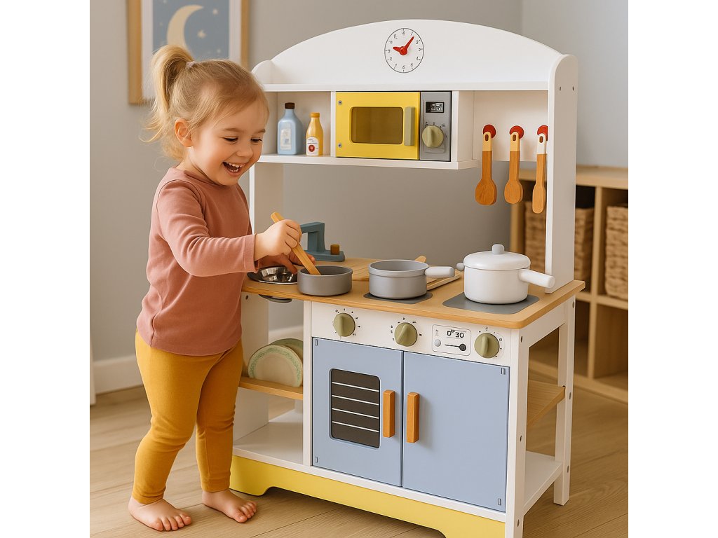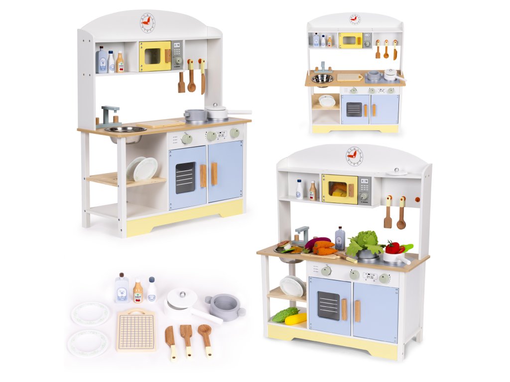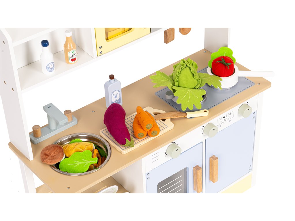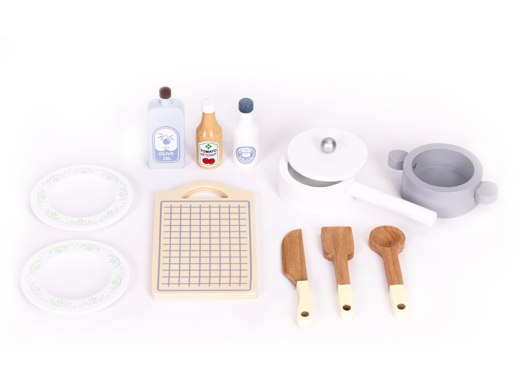 Súčasťou kuchynky je sada drevených doplnkov, ktoré obohatia hru a umožnia vám ihneď začať kulinárske dobrodružstvo. Vaše dieťa tu nájde všetko, čo malý kuchár potrebuje: