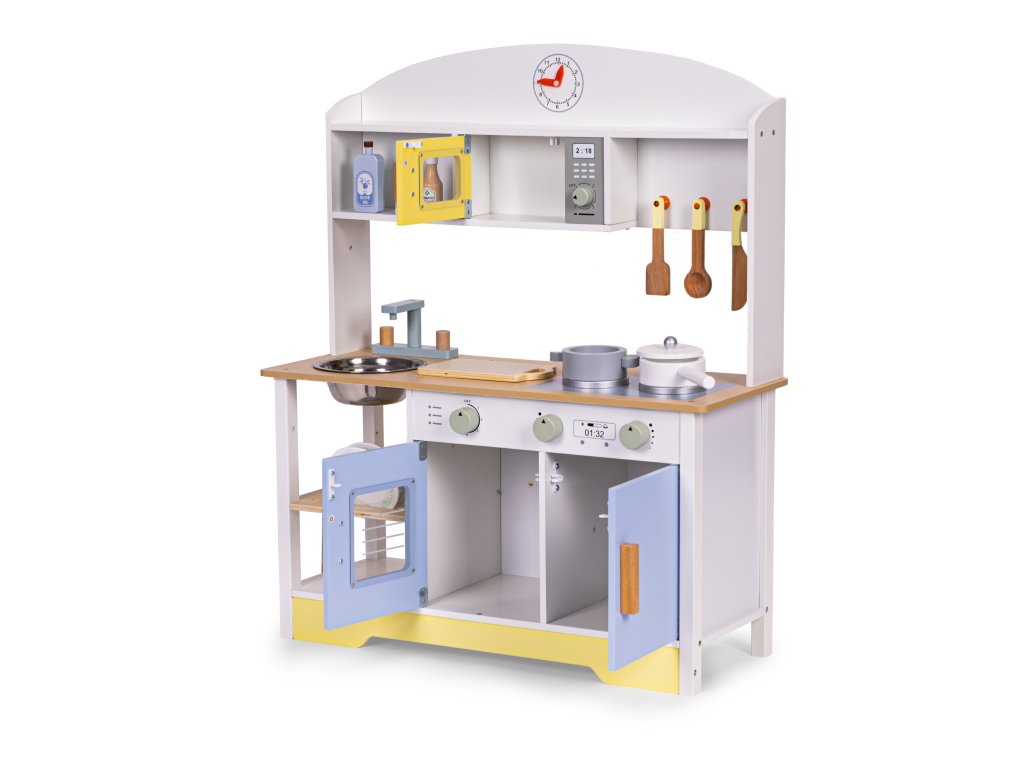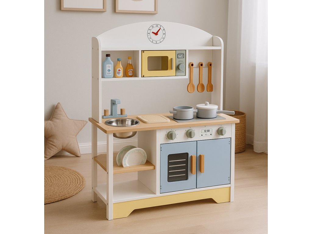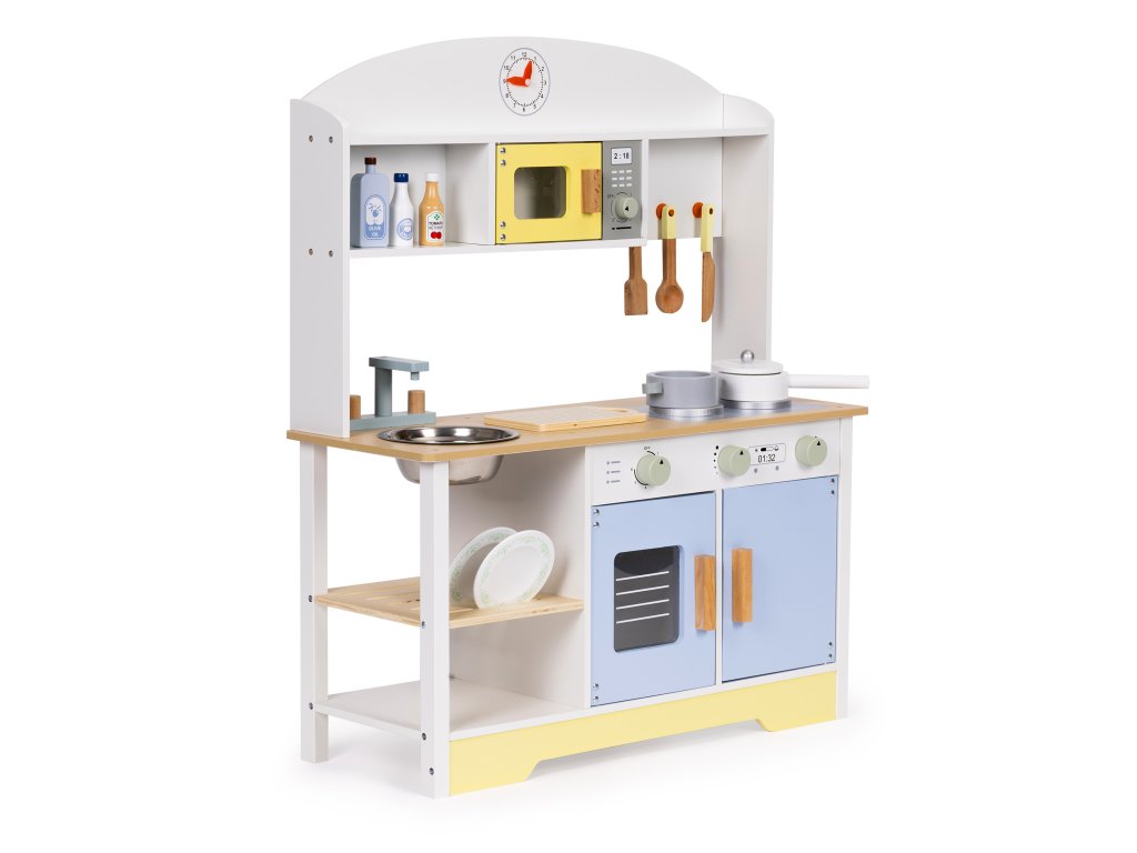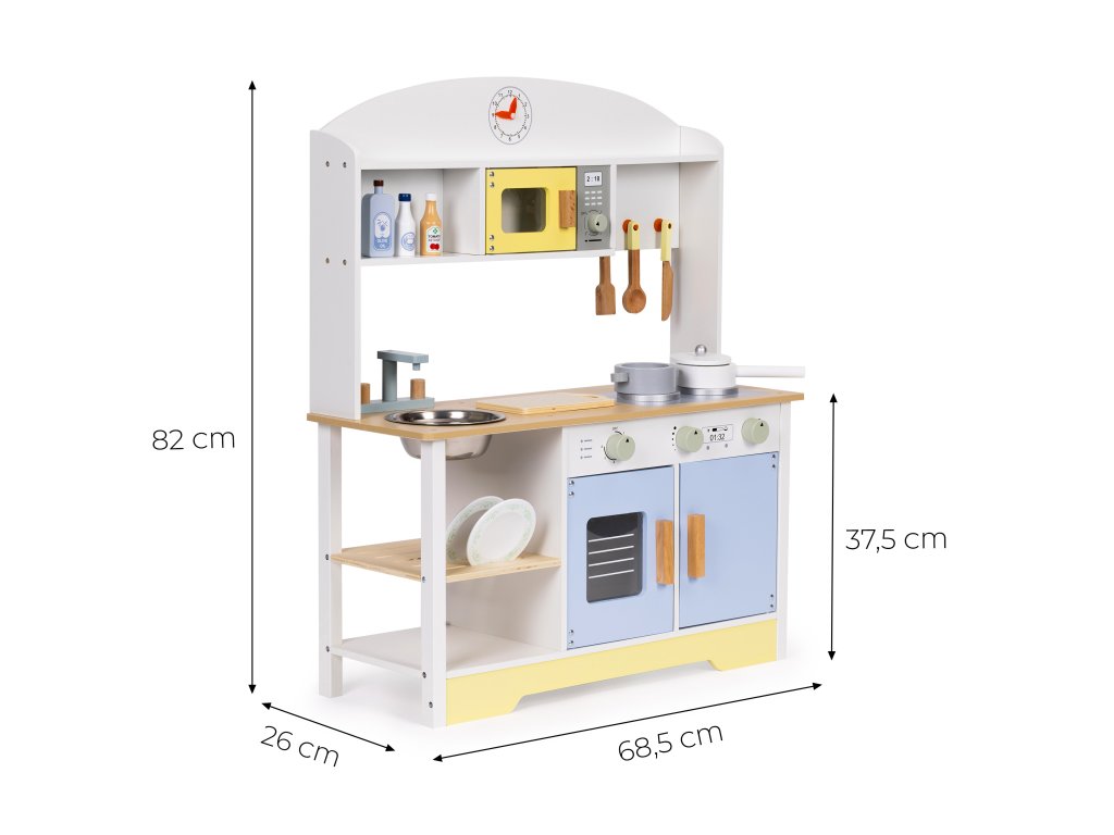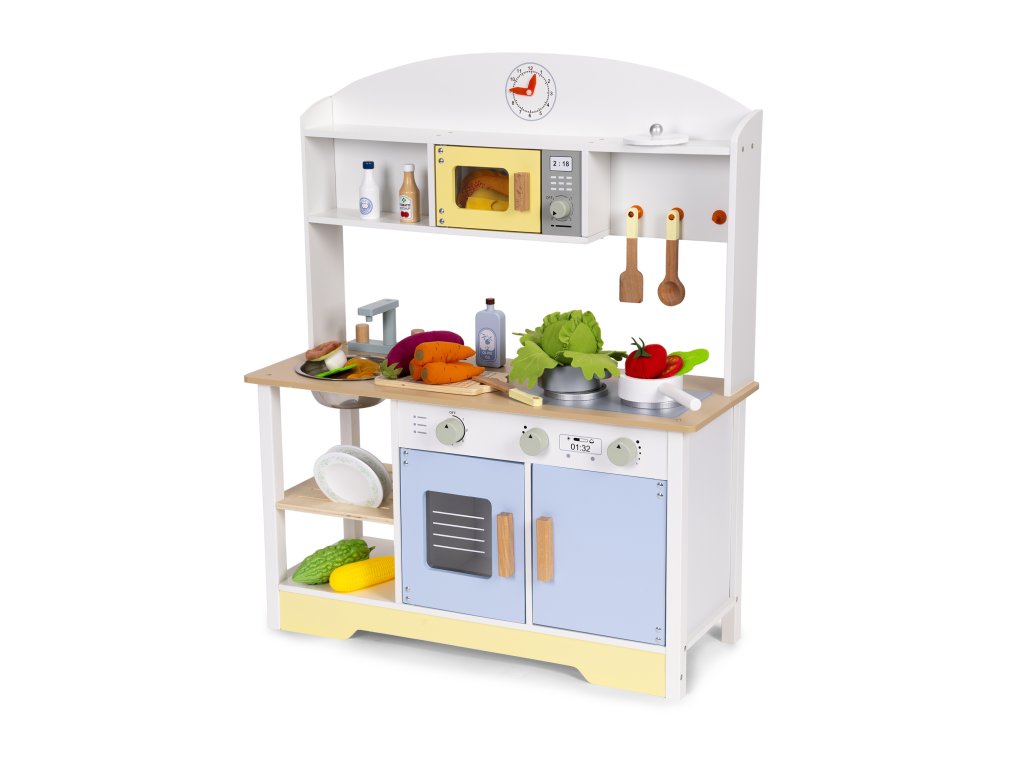 Súčasťou kuchynky je sada drevených doplnkov, ktoré obohatia hru a umožnia vám ihneď začať kulinárske dobrodružstvo. Vaše dieťa tu nájde všetko, čo malý kuchár potrebuje: