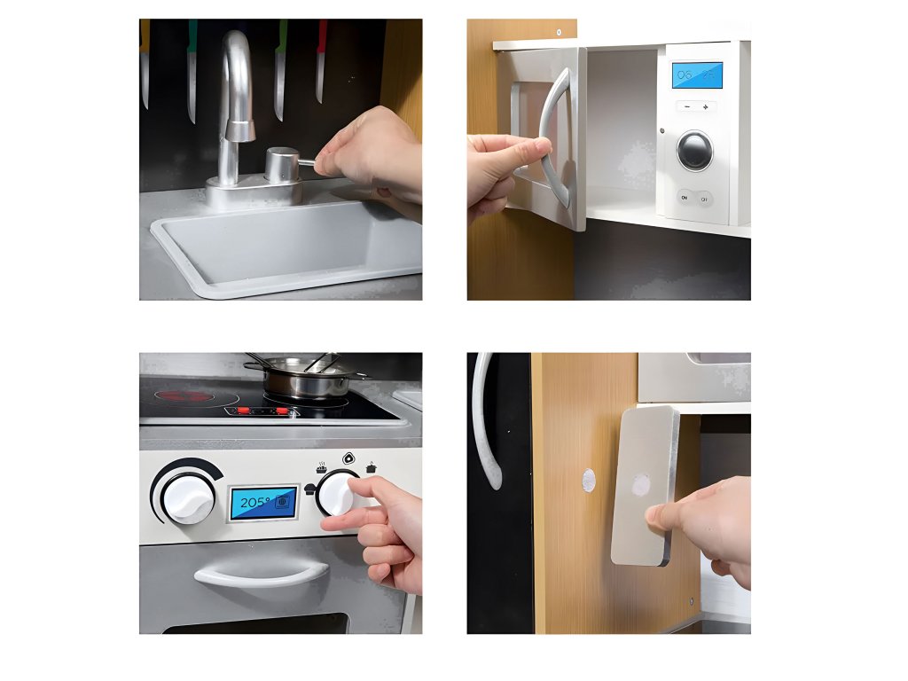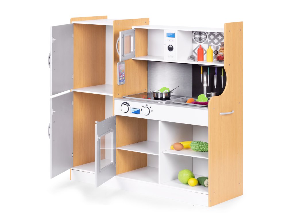 Na kuchynskej linke sa nachádza varná doska s 2 horáky, otočný kohútik a drez, vďaka nim môžu deti variť chutné jedlá a potom umyť riad v dreze. V kuchyni je veľa otváracích skriniek, ktoré sa dajú použiť ako chladnička, rúra, mikrovlnná rúra - všetko ako v skutočnej kuchyni. Skvelým doplnkom sú dvere natreté špeciálnou farbou, ktorá ich premení na kriedovú tabuľu, šéfkuchár si na ne môže napísať svoj recept alebo aktuálne menu. Na stene chladničky je pripevnený ( suchý zips ) telefón na hranie, ktorá vám umožní byť v kontakte s vaším malým kuchárom.
