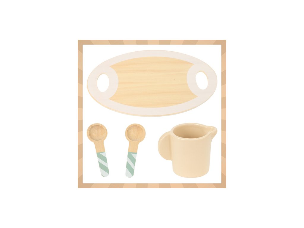 - materiál: riad (drevo + melamín) a príbory (drevo) + tácka a podtácky (preglejka) + doplnky (preglejka + netkaná textília + polyester)