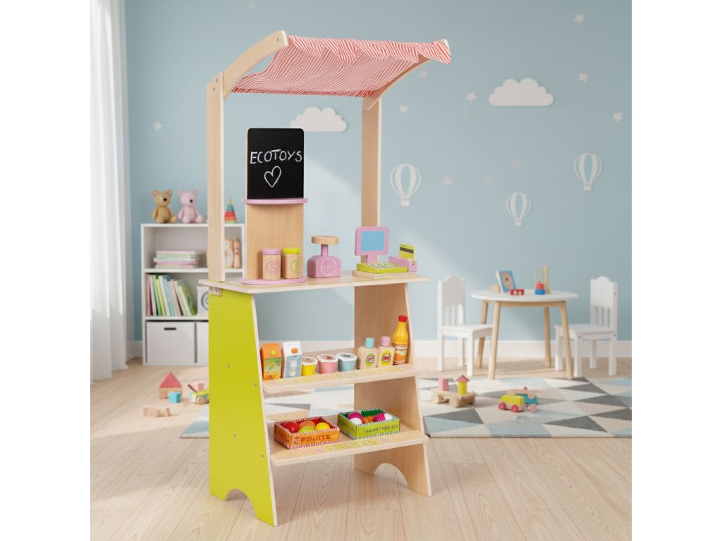 Drevený stánok ECOTOYS povzbudzuje deti k aktívnemu hraniu rolí a učí ich základnému spoločenskému správaniu, ako je nakupovanie, predaj a počítanie. Táto hračka je ideálna pre doma, ako aj v detskej izbe alebo herni. Je to skvelý nástroj pre učiť sa spolupracovať, komunikovať a tvorivo myslieť. Vďaka prítomnosti pokladne, terminálu, váhy a množstva potravinárskych výrobkov sa hra stáva reálne, a zároveň pútavé. Produkt rozvíja koordináciu rúk a očí, podnecuje predstavivosť a povzbudzuje dieťa k samostatnému konaniu.