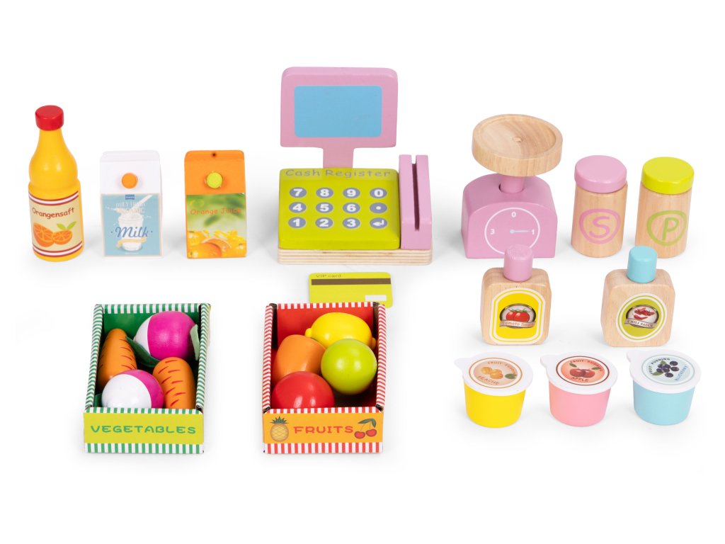 - Zelenina a ovocie - farebné prvky imitujúce potraviny umožňujú učenie názvov, farieb a tvarov. Sú ideálne na zábavné nakupovanie, varenie a triedenie.