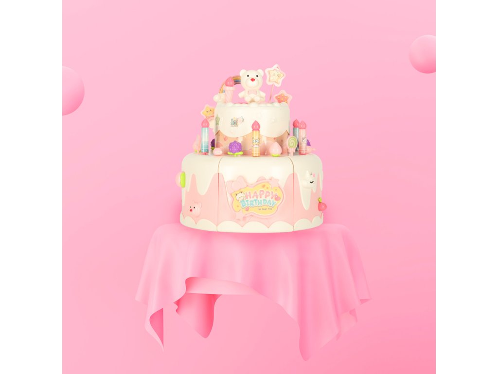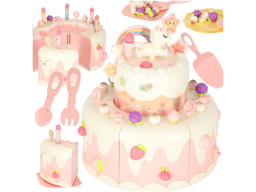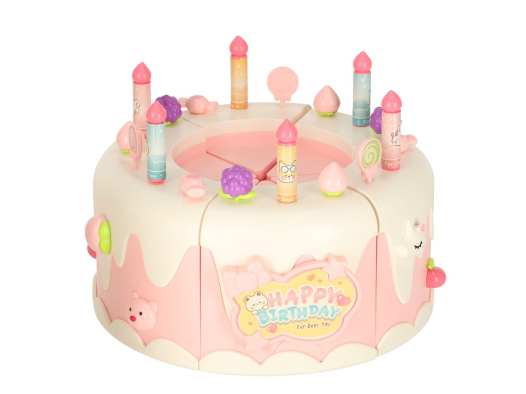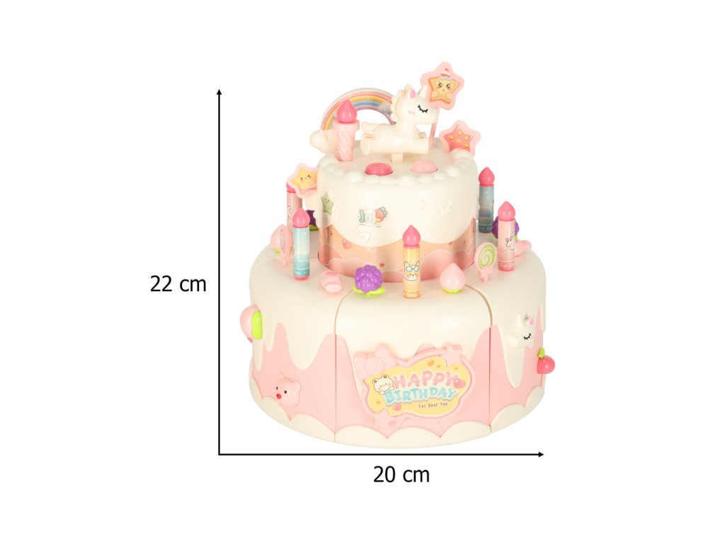 Interaktívna narodeninová torta so zvukom a pohybom, s figúrkami, sviečkami a príborom. Obsahuje 16 dielov. Ideálna pre deti od 3 rokov. Vysoká 22 cm, s detailnými rozmermi príslušenstva. Zábava plná farieb a hudby!