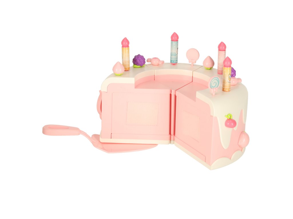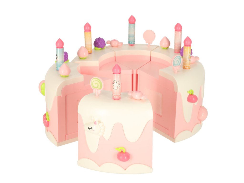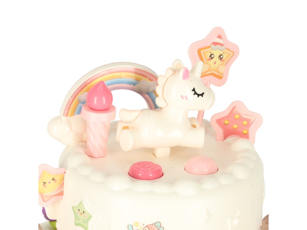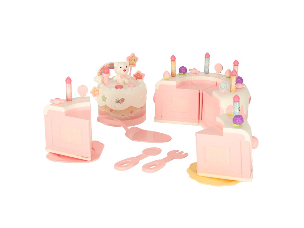 Interaktívna narodeninová torta so zvukom a pohybom, s figúrkami, sviečkami a príborom. Obsahuje 16 dielov. Ideálna pre deti od 3 rokov. Vysoká 22 cm, s detailnými rozmermi príslušenstva. Zábava plná farieb a hudby!