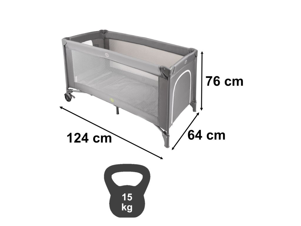 Rozmery detskej postieľky: - Celková výška: 76 cm- Šírka: 124 cm- Hĺbka: 64 cm- Vnútorné rozmery: 60 x 120 cm- Výška od zeme: 15 cm- Zosilnený rám v tvare X pod postieľkou- 2 nožičky - 2 aretované kolieska - Rozmery v zloženom stave: 23 x 24 x 80 cm