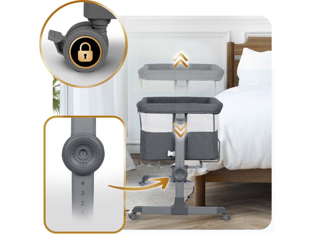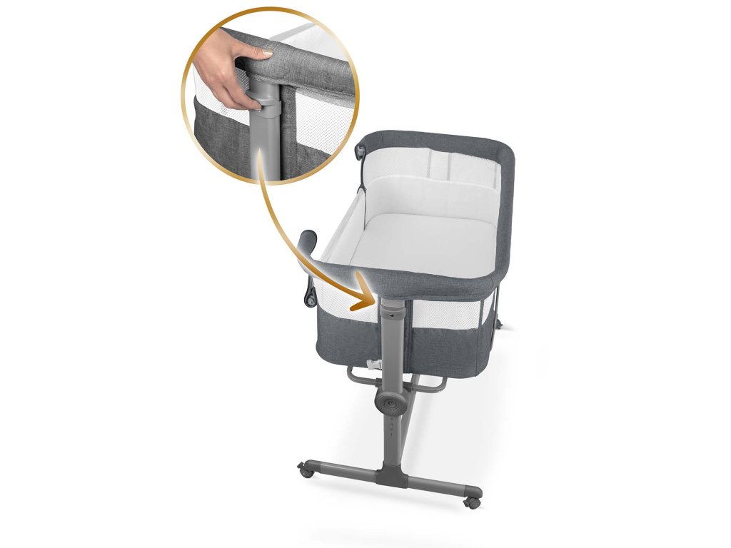 - Detská postieľka má nezávislé nastavenie výšky na oboch stranách, čo umožňuje prispôsobenie na úroveň postele rodičov a poskytuje pohodlie dieťaťu aj rodičom.