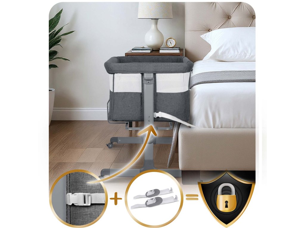 Pevné a ľahko zmontovateľné bezpečnostné popruhy zabezpečujú pevné spojenie medzi podsedákom a posteľou rodičov.