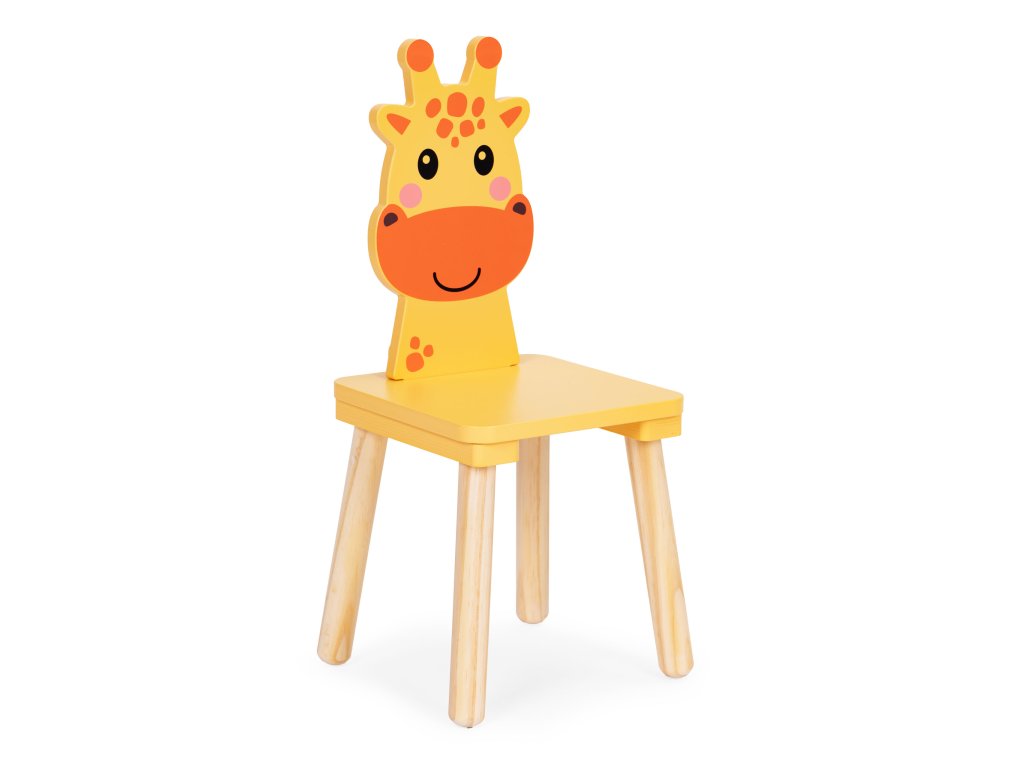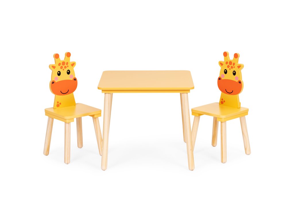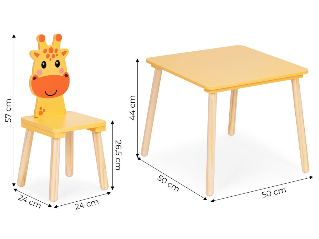 Súprava obsahuje dve pohodlné stoličky určené na pohodlie a ergonómia pre malé deti. Ich rozmery boli dokonale prispôsobené výške stola, čo umožňuje dieťaťu zaujatie správneho postoja počas sedenia a poskytuje úplnú voľnosť pohybu - počas hry aj učenia. Operadlá v tvare žirafy priťahujú pozornosť a vnášajú do interiéru veselú, detskú atmosféru.