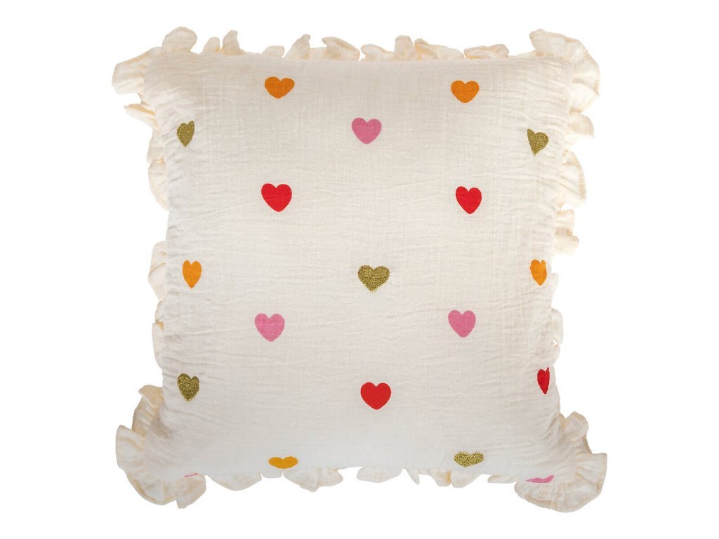 Dekoratívny vankúš s motívom srdiečok bude ozdobným doplnkom do detskej izby či hracieho kútika ,alebo sa dá využiť jednoducho ako vankúš na maznanie.