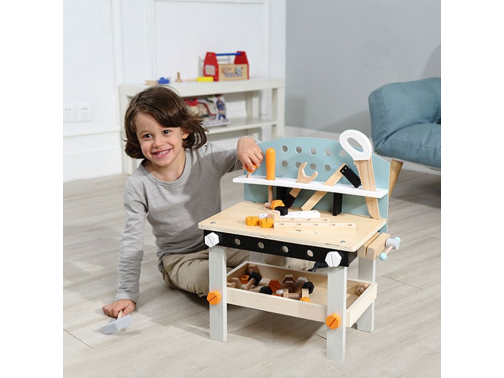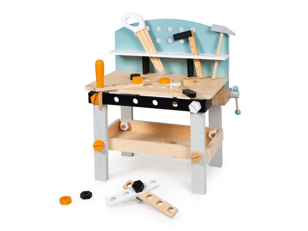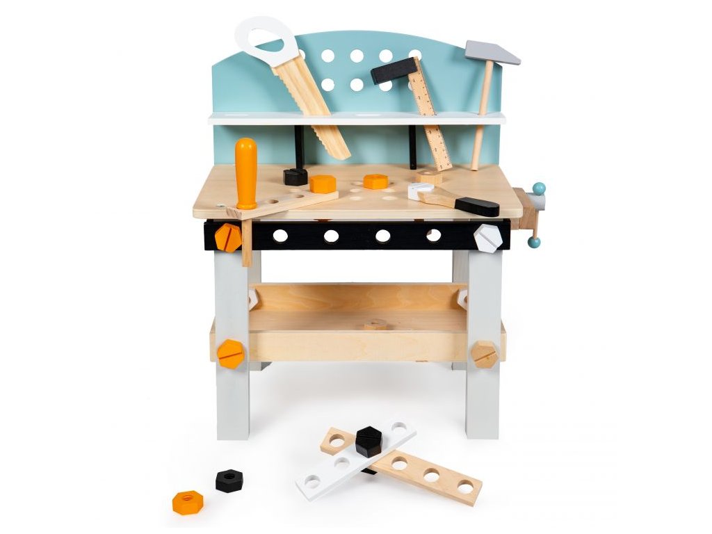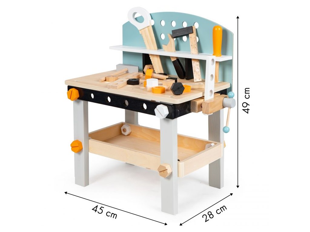 Dajte svojmu dieťaťu príležitosť prevziať úlohu malého majstra sdrevená dielňa ECOTOYS. Súprava obsahuje až38 prvkov, ktoréspestrite svoju hru a veľa zábavy. Veľká horná časť s otvormi, organizér na náradie aprídavná polica pod pracovnou doskou poskytne deťom pohodlie ajednoduchá údržba.