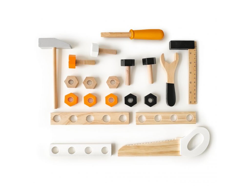 Všetky nástroje a príslušenstvo sú vyrobené z dreva abez ostrých a nebezpečných hrán. Budúci domáci majster má: