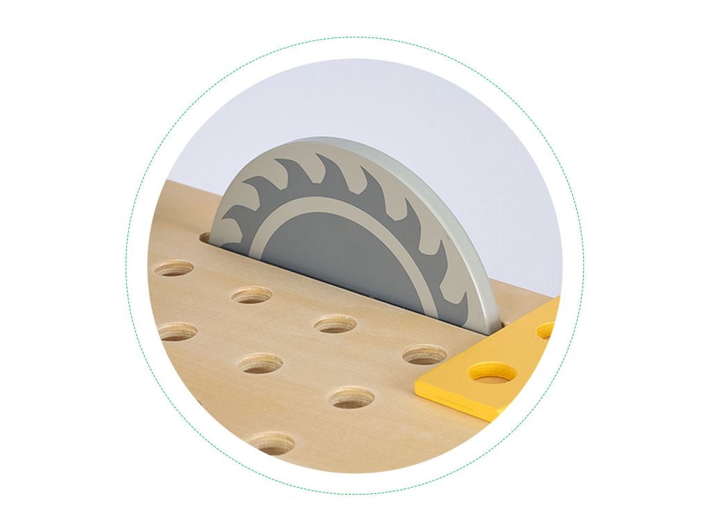 Všetky nástroje a príslušenstvo sú vyrobené z dreva, natreté bezpečnými farbami a bez ostrých a nebezpečných hrán.