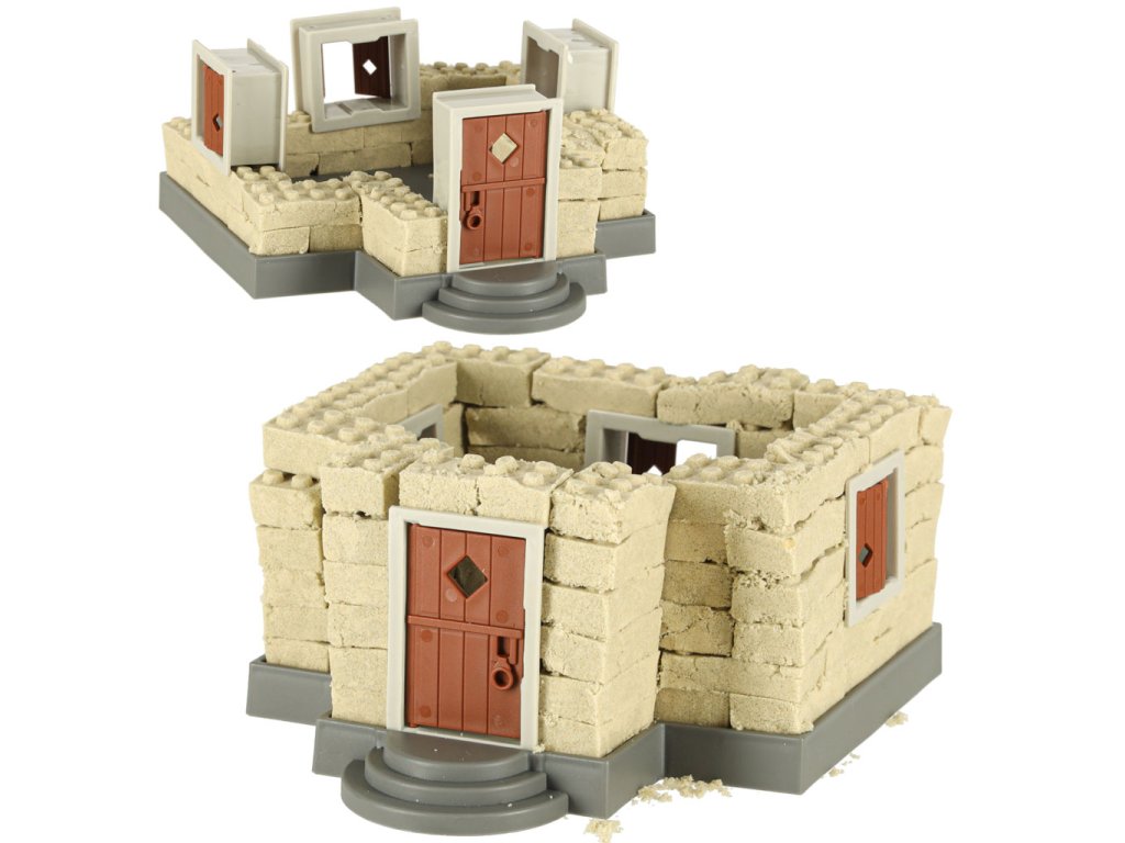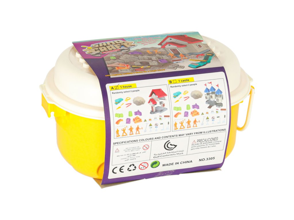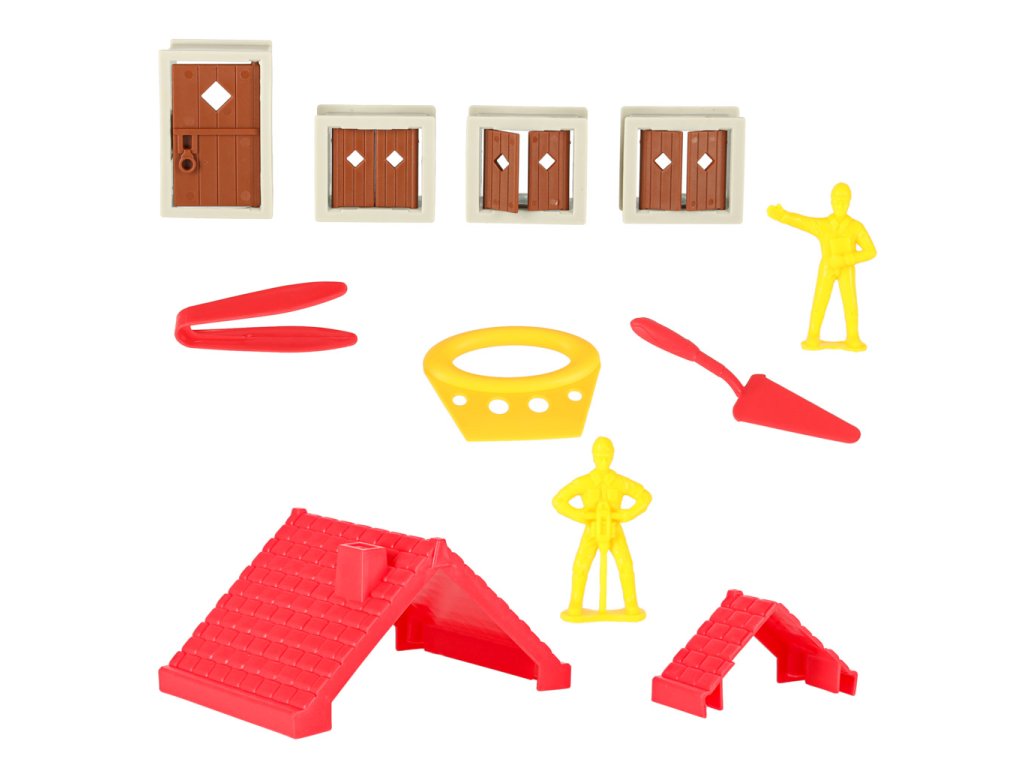 Obsah sady: - Kôš- Veko koša- Piesok 750 g- Prvky domčeka (základy, strecha, dvere, okná, rámy dverí a okien)- 6x formičky do piesku- 2x figúrky ľudí - (Sada obsahuje 2 ľudí v rôznych pózach. Vzory figúrok sa môžu v jednotlivých sériách líšiť)- Výrobník pieskových tehličiek- náradie na piesok (lopatka a kliešte)- triedička piesku- časti koša (kolieska, rukoväť atď.)- dopravné značky + nálepky- návod na použitie Technické špecifikácie: