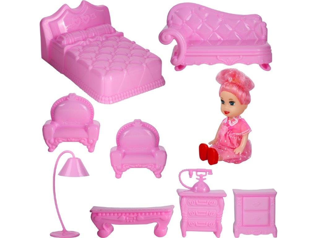 Zahrnuté:- terasový nábytok a terasový slnečník- bábika: dĺžka: 10 cm, šírka: 3,5 cm, hrúbka: 2,5 cm, pohyblivé nohy a ruky, otočná hlava, hlava z mäkkého plastu.- lôžko: dĺžka 9 cm, šírka 6 cm, výška 4,5 cm- 2xpohovka- toaletný stolík - výška 9 cm, šírka 8 cm- šatníková skriňa - v. 9 cm, š. 6 cm- nočný stolík- lampa - V 9 cm, Š 4 cm- 2xkreslo - v 6 cm, š 5,5 cm- stolička toaletného stolíka- komoda- puf