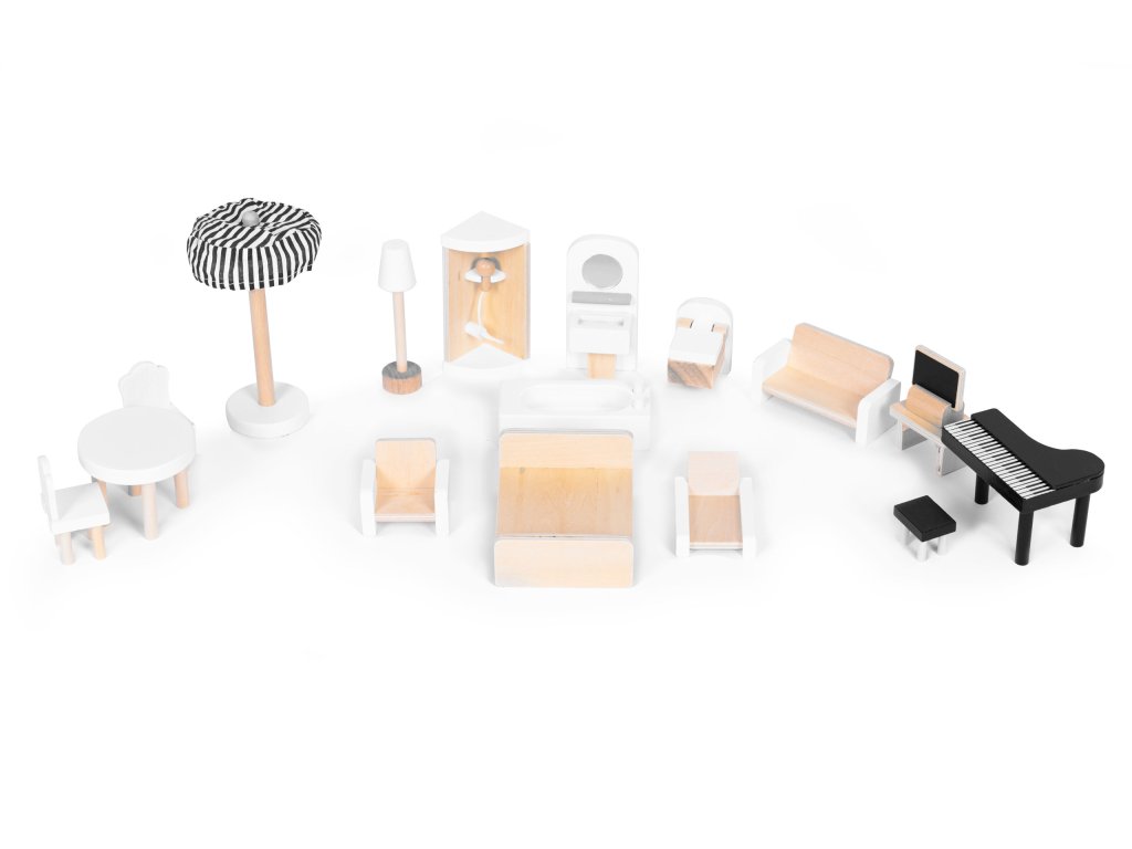 Súprava obsahuje aj sada 15 kusov dreveného nábytku ktoré sa dajú odstrániť a premiestniť bez akýchkoľvek obmedzení.