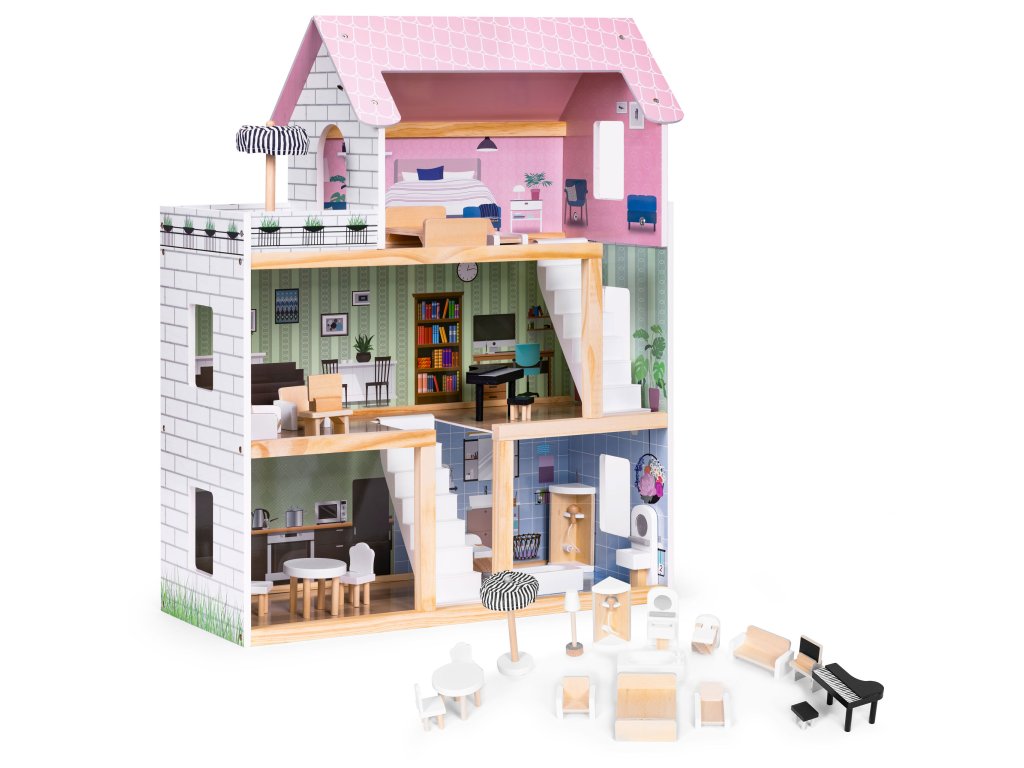 Drevený domček pre bábiky, 3 poschodia s terasou, 15 ks nábytku