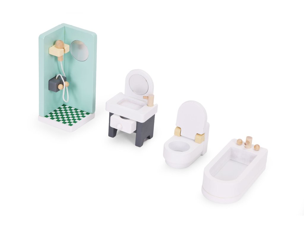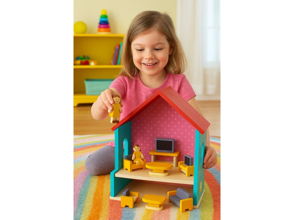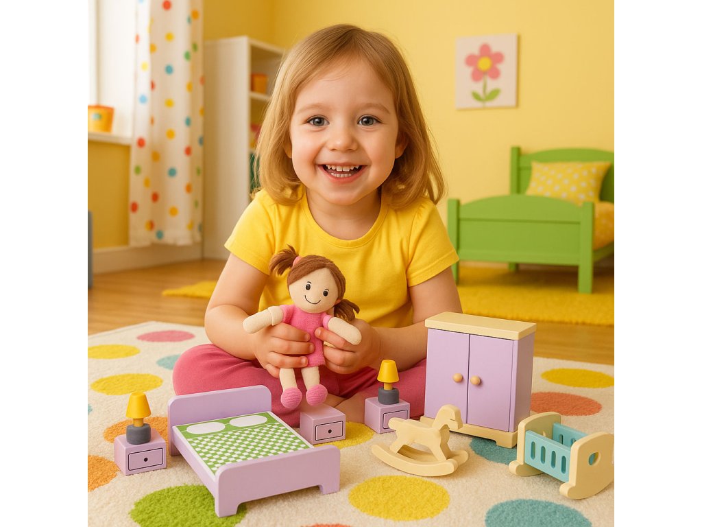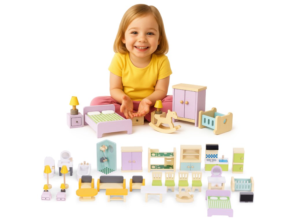 Súprava dreveného nábytku je dokonalým doplnkom každéhomenší domček pre bábikyale bude dobre fungovať aj akosamostatná súprava na tvorivú hru. Prvky boli navrhnuté tak, abymenšie bábikytakže sa perfektne hodia do kompaktných priestorov a nevyžadujú veľký dom. Vďaka rôznorodému nábytku si vaše dieťa môže zariadiť obývačku, spálňu, kuchyňu, kúpeľňu a jedáleň - vytvárať vlastné príbehy a hrať každodenné situácie. Táto forma hryrozvíja predstavivosť, učí plánovaniu a podporuje emocionálny rozvoj. Nábytok možno ľubovoľne prestavovať a kombinovať, čo stimuluje kreatívne myslenie a podporuje spoločnú hru s rovesníkmi.