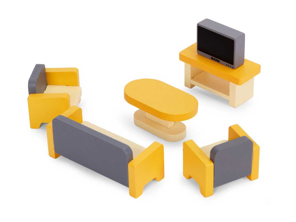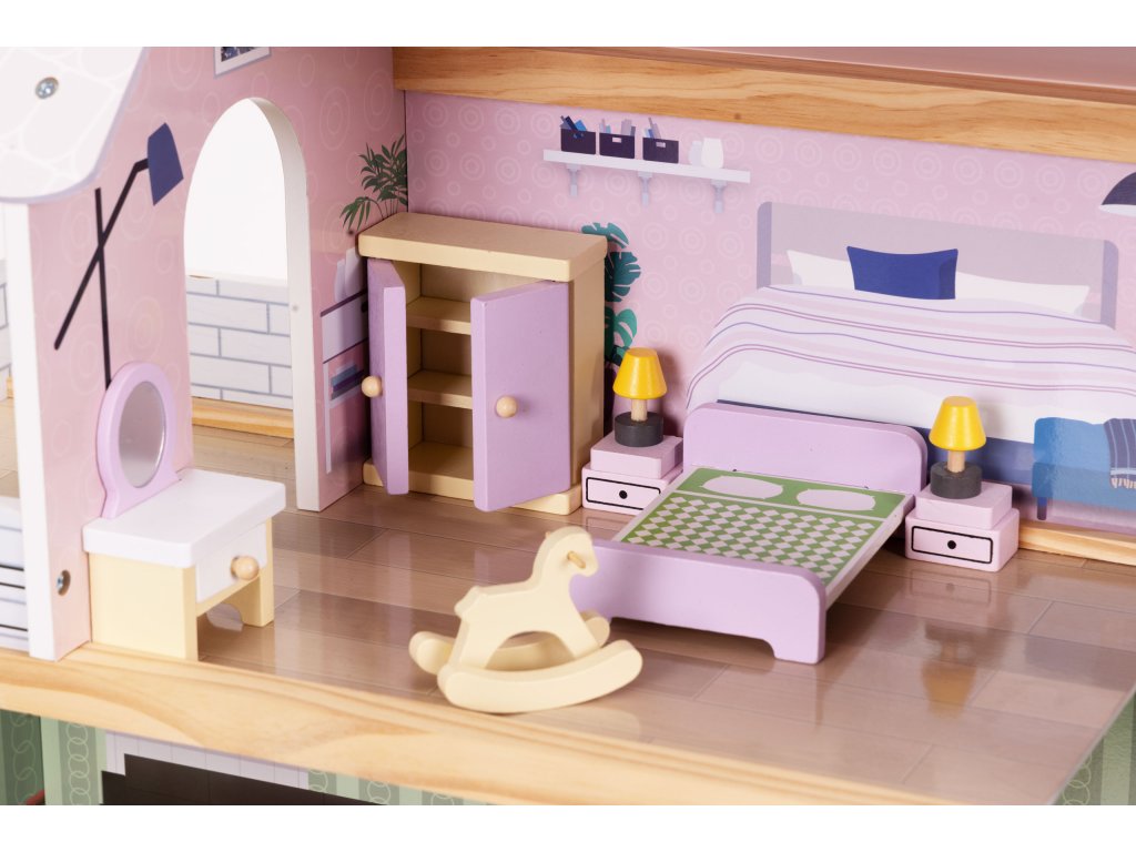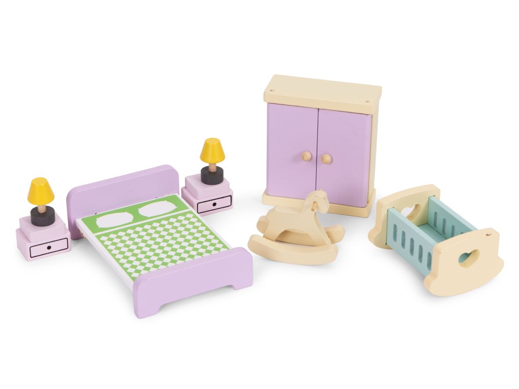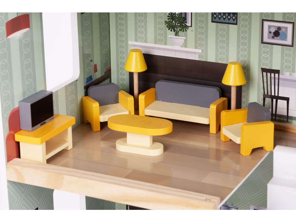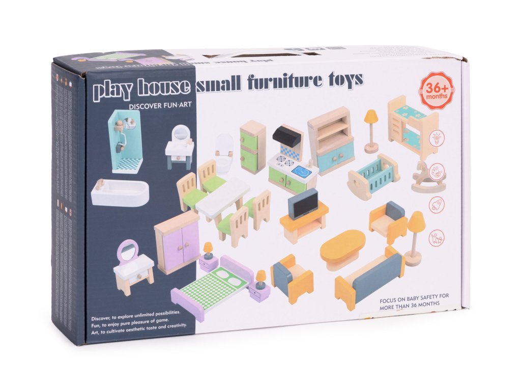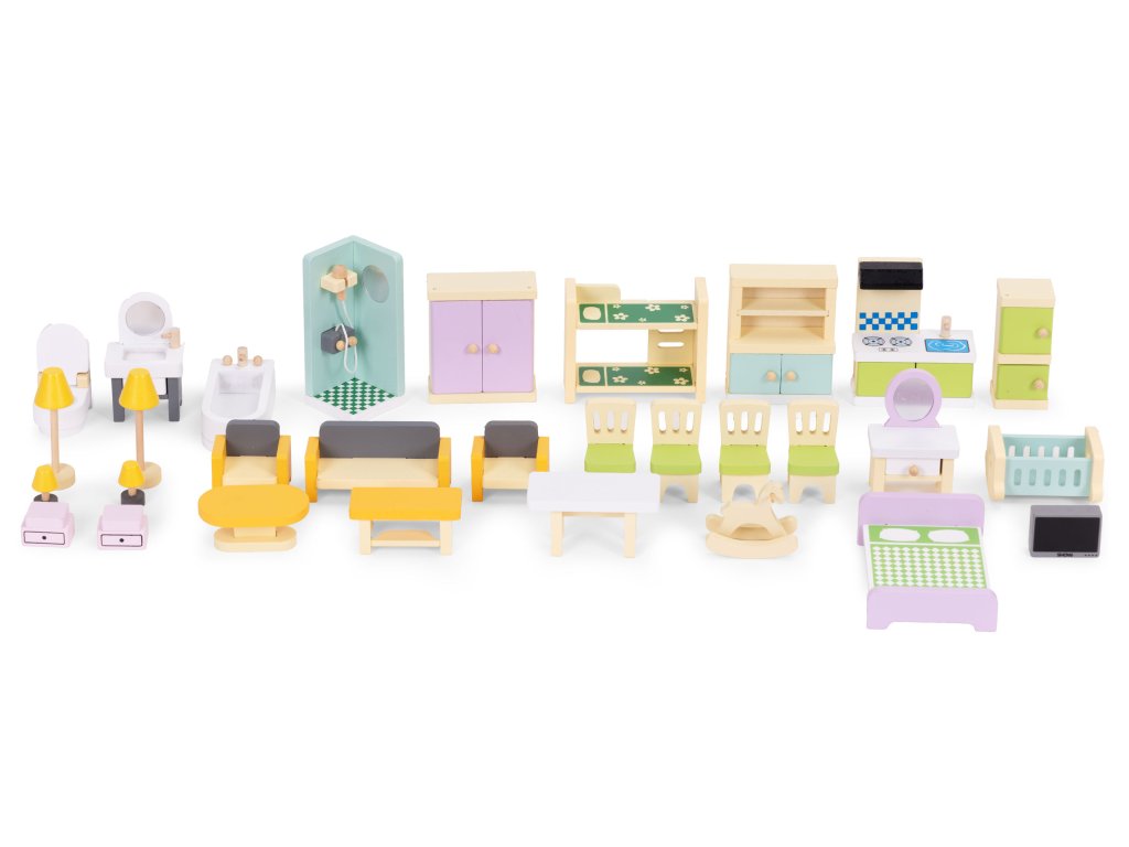 Sada obsahuje až30 drevených komponentovktoré umožňujú vybaviť celý domček pre bábiky. Patrí k nim nábytok do rôznych miestností: