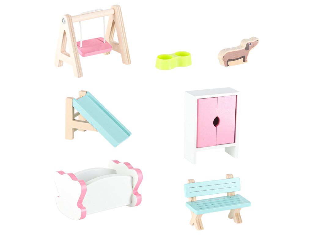 - Nábytok - stôl, 2 stoličky, hojdačka, toaleta, lehátko, lavička, detská postieľka, lampa, miska pre psa, skriňa, sporák, umývadlo