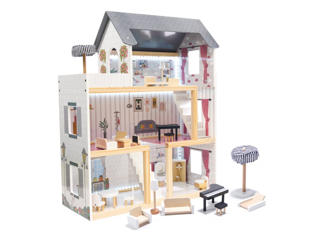 Moderný drevený domček pre bábiky s 4 izbami a terasou. Plne vybavený s LED osvetlením, dreveným nábytkom a detailmi. Podporuje kreativitu a manuálne zručnosti detí, zároveň je bezpečný a esteticky pekný. Rozmery: 62 x 27 x 78 cm. Ideálny doplnok do detskej izby.