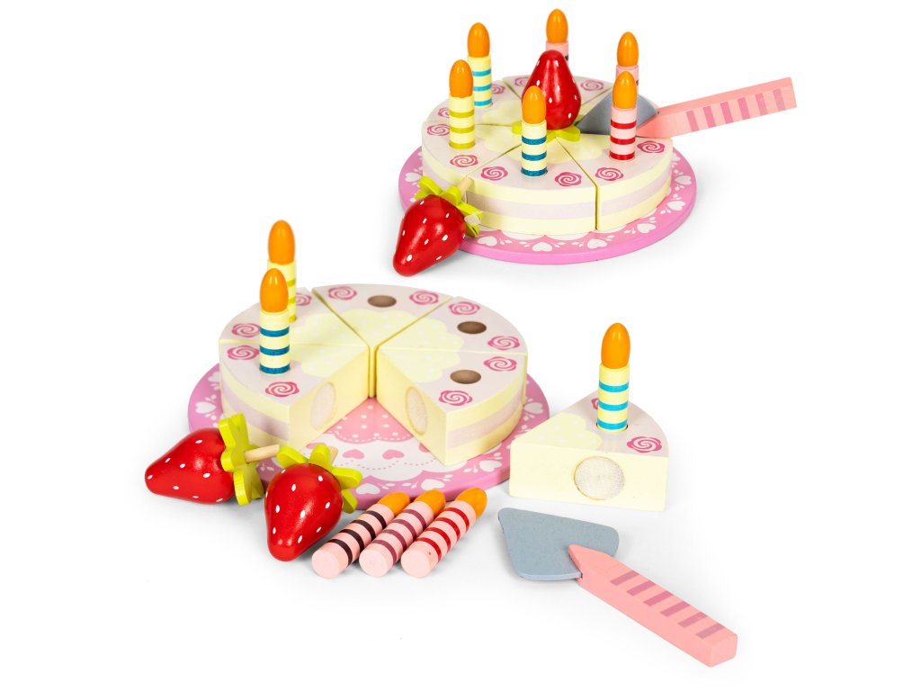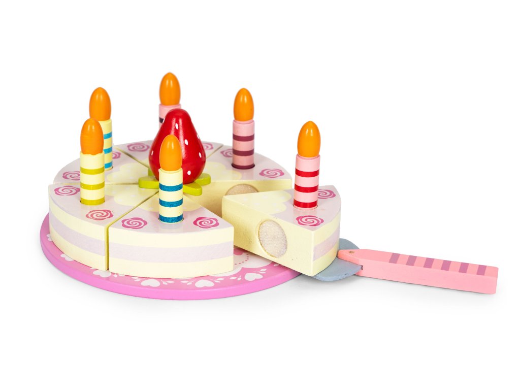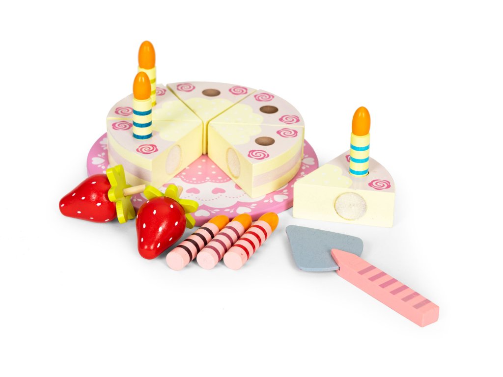 Vsuvné drevené sviečky na tortudodať autenticitu a umožniť batoľatám zahrať veselé scénky z narodeninových osláv. Drevená jahoda prepožičiavafarebnosť a príchuť celej hry. Deti môžupoužite ho na zdobenie tortya zároveň zdokonaľovať svoje zručnostimotorické a manuálne zručnosti.