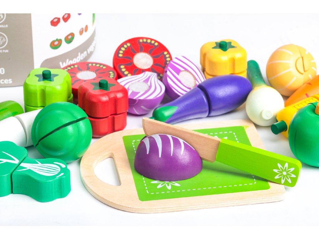 Všetky komponenty súpravysú vyrobené z dreva a boli pokrytés farbou bezpečnou pre deti. Zelenina sa skladá z dvoch polovíc spojených suchým zipsom, takže dieťa môže vidieť, ako zelenina vyzerá zvnútra, a to tak, že ju môže prekrojiť. Každá zelenina bola vyrobená s veľkým dôrazom na detail. Súprava obsahuje ajdrevená doska na krájanie a nôž. Keďže zelenina je spojená suchým zipsom, pri krájanísuchý zips kladie odpor a vydáva zvuk ako pri krájaní skutočného ovocia.