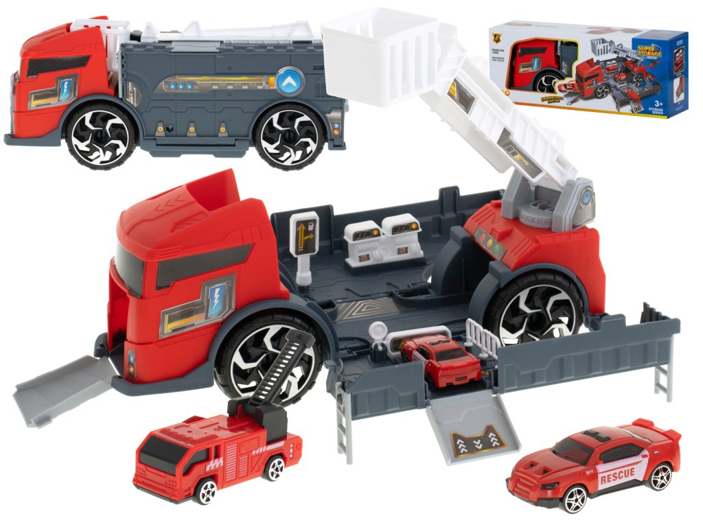 Transportér TIR 2v1 parkovacia garáž hasiči + 3 autá červená