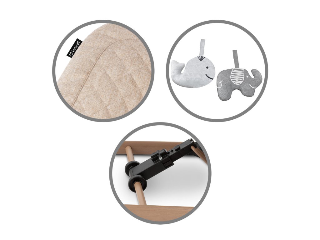Kidwell Laro je vybavený odnímateľnou hrazdičkou s dvoma vyberateľnými hračkami. Dve plyšové hračky, ktoré sú zavesené na suchý zips, sa dajú ľahko odpojiť a vyprať .