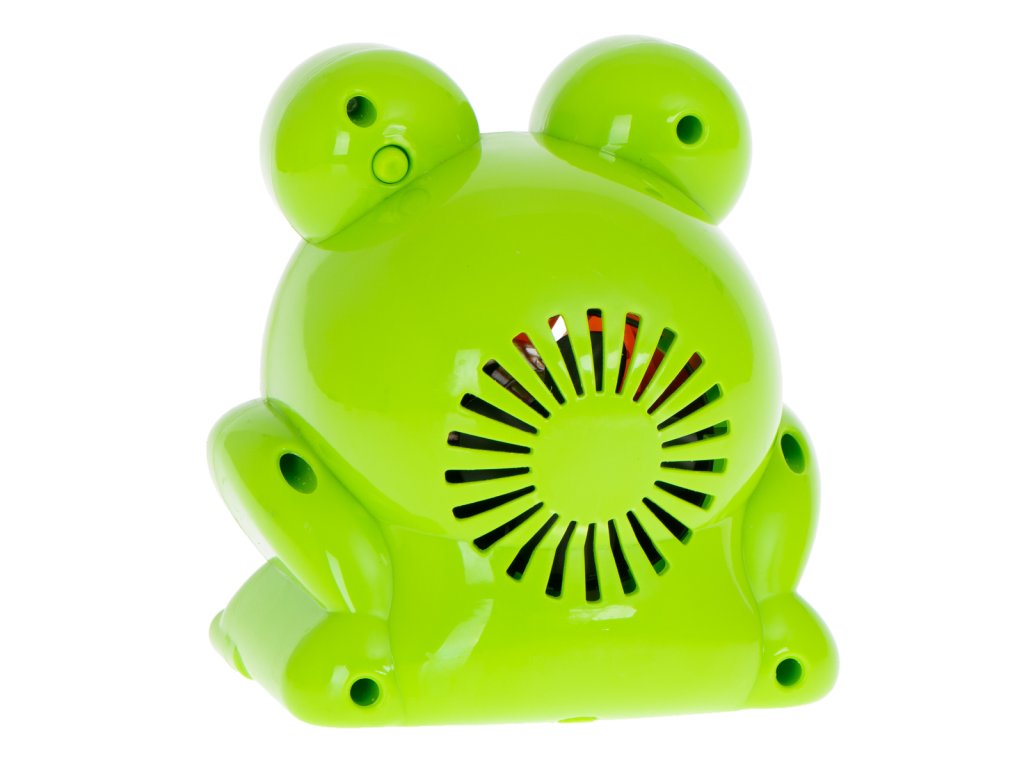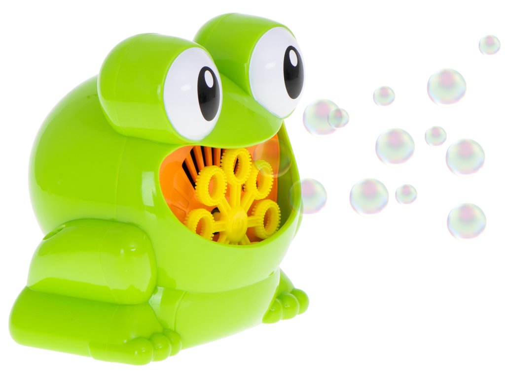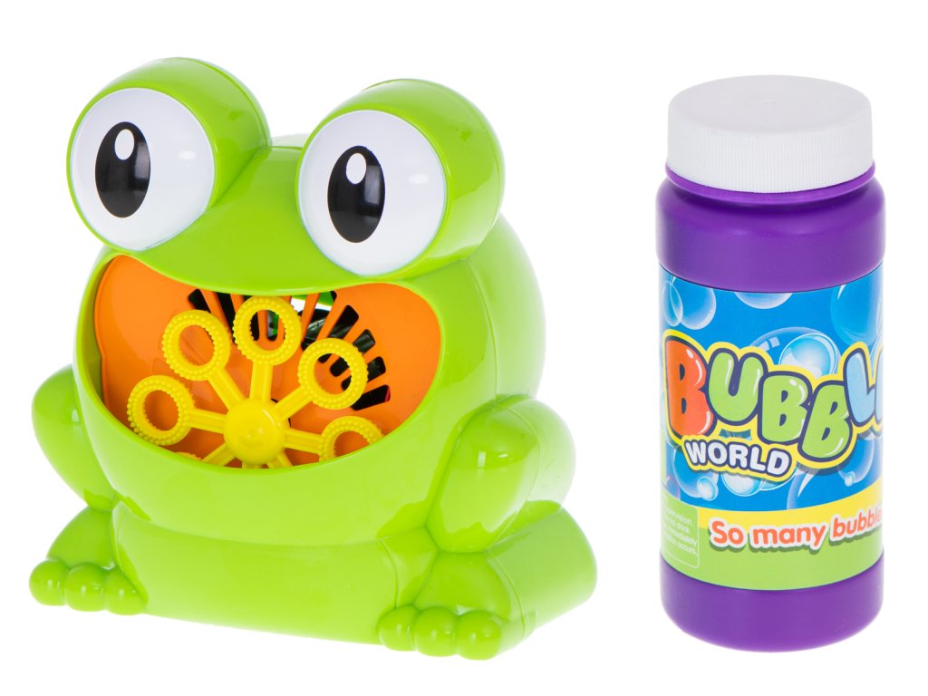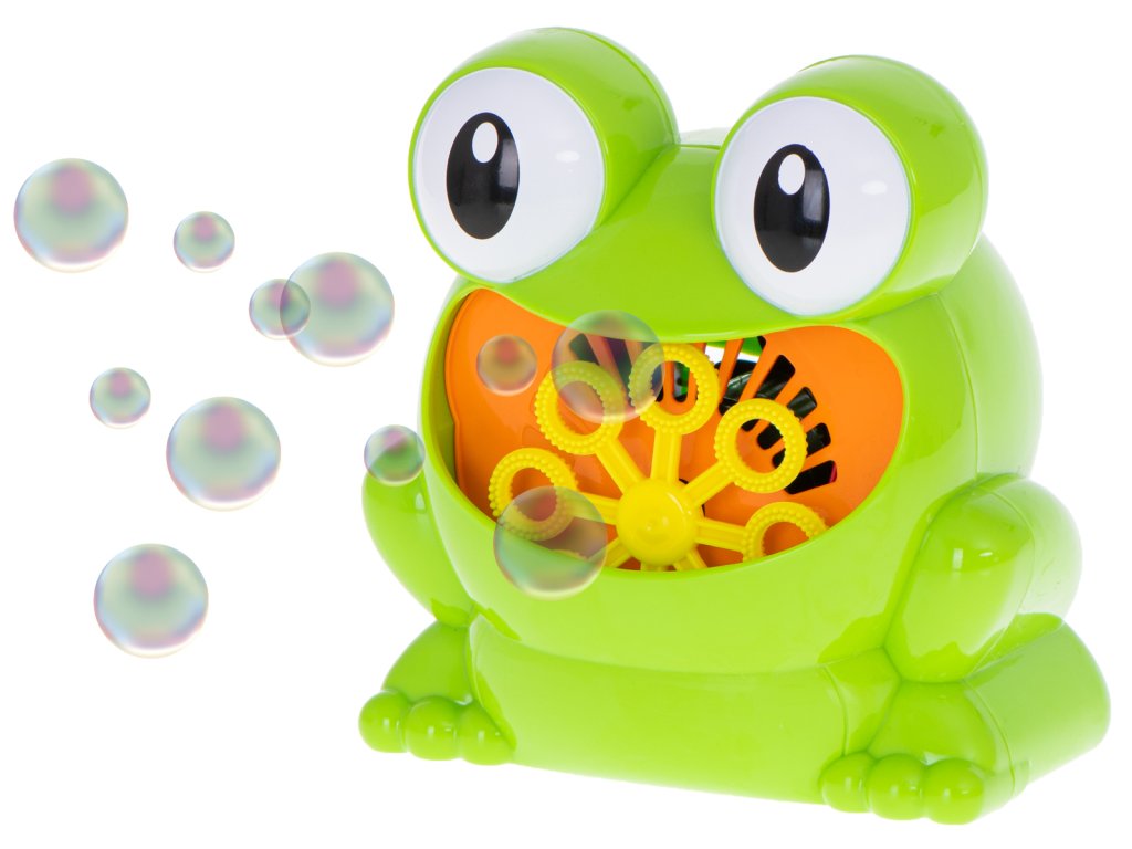 Mydlové bubliny sú obľúbenou zábavou malých aj veľkých detí. Senzačný stroj na mydlové bubliny v tvare zelenej žaby poskytne veľa zábavy každému dieťaťu. Hračka umožňuje vypúšťať farebné bubliny zo strojčeka. Stačí naliať tekutinu do otvoru, v ktorom sa nachádza disk s očami, zapnúť tlačidlo umiestnené za pravým okom žaby, čím sa aktivuje veterný mlyn a otáčanie disku, a je hotovo. Hračka pri otáčaní disku uvoľňuje magické dúhové bubliny.
