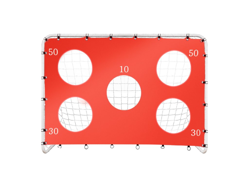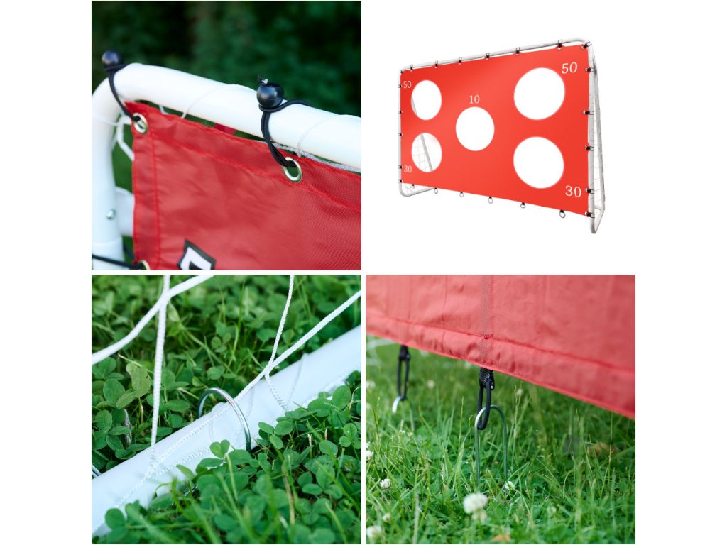 - Materiál: plast + polyester + pozinkovaná oceľ- Farba: biela a červená s čiernymi a striebornými prvkami- Rozmery podložky: 197 × 137 cm- Počet otvorov: 1: - Priemer otvorov: cca 40 cm- Výška bránky: 152 cm- Šírka bránky: 213 cm- Hĺbka bránky: 76 cm- Priemer rúrky: 1,5 mm: 3 cm- Oko siete: 9,5 cm- balenie: kartón 86 × 29 × 12 cm
