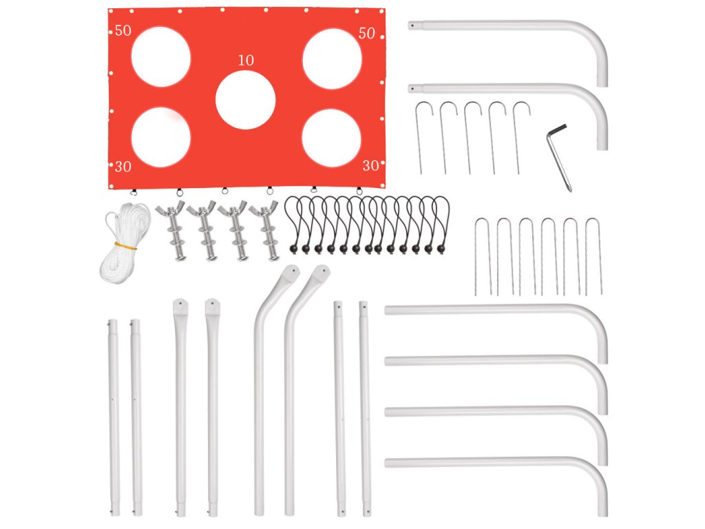 - Konštrukcia bránky z pozinkovanej oceľovej rúrky- Súprava montážnych komponentov- 4 × skrutky- 4 × skrutkovacie matice- 1 × imbusový kľúč- 1 × odolná sieť- 1 × cieľová podložka s otvormi a označením bodov (10, 30, 50)- 11 × kolíkov na upevnenie bránky v zemi- 18 × háčikov na upevnenie siete- 4 × šnúrky na upevnenie siete- Návod na použitie