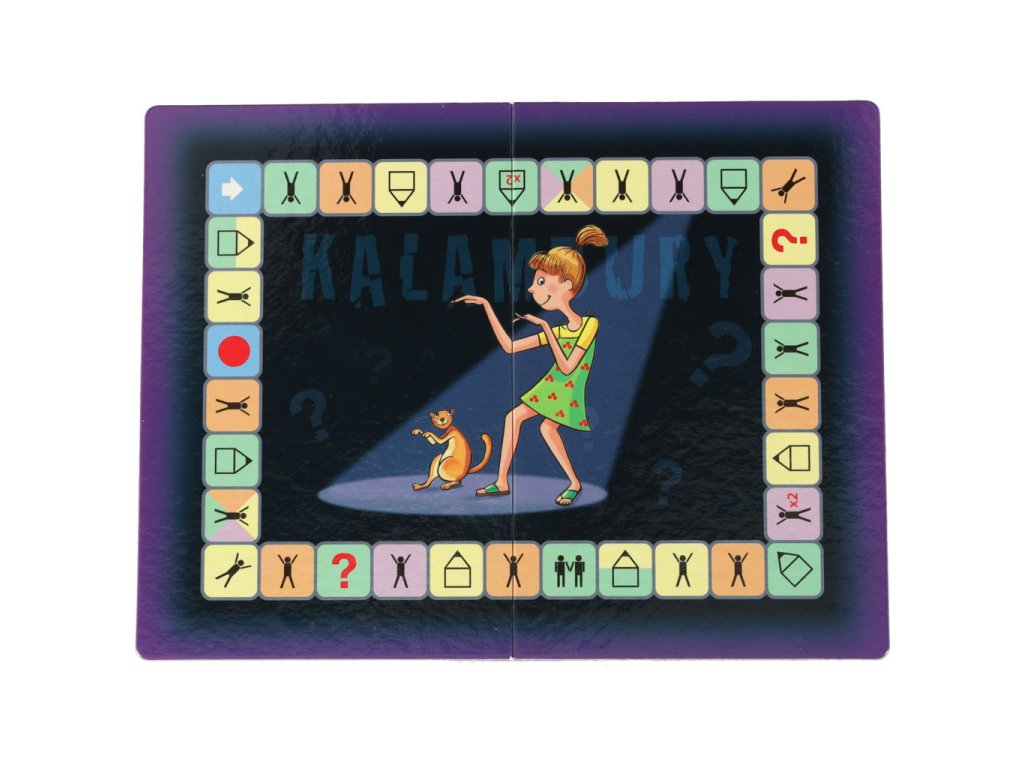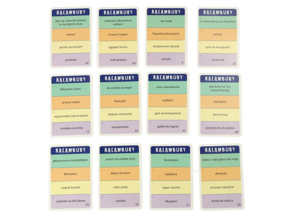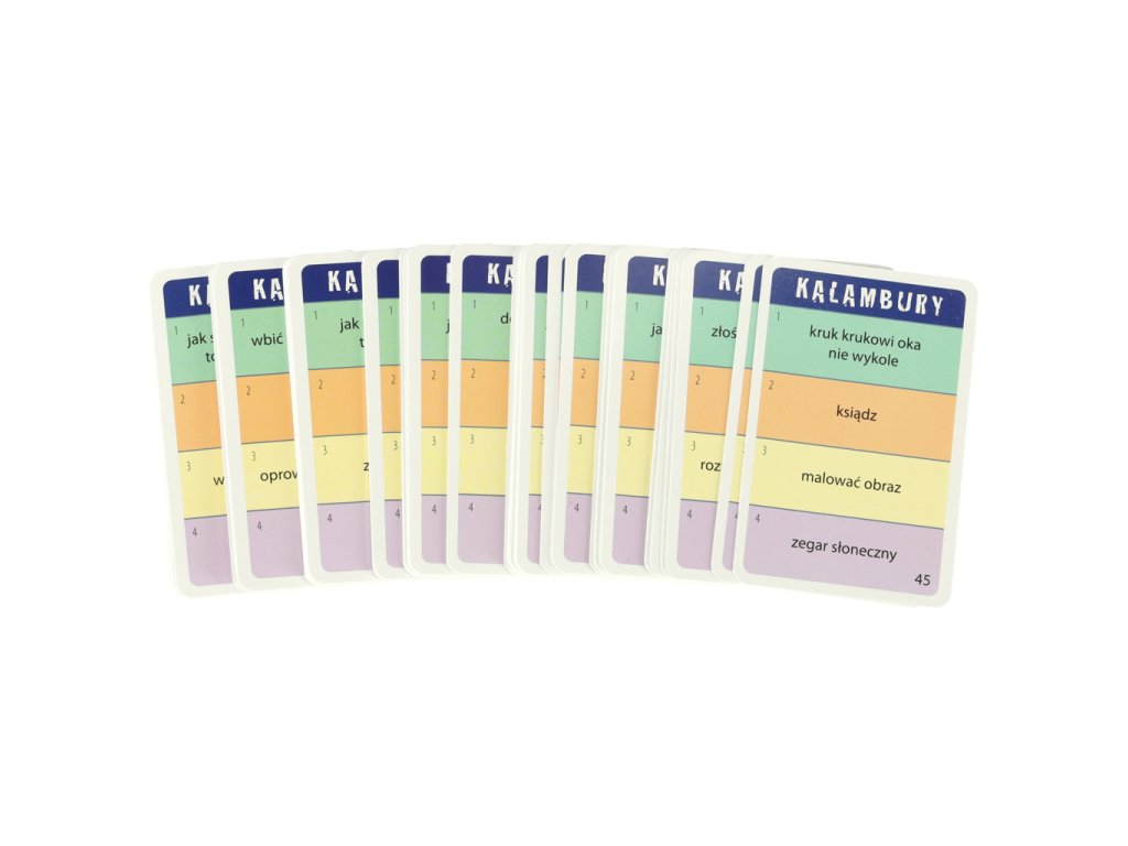 Obojstranné karty - 55 kusov, hracia doska, pešiaci - 2 kusy, hracia kocka, presýpacie hodiny, návod.
