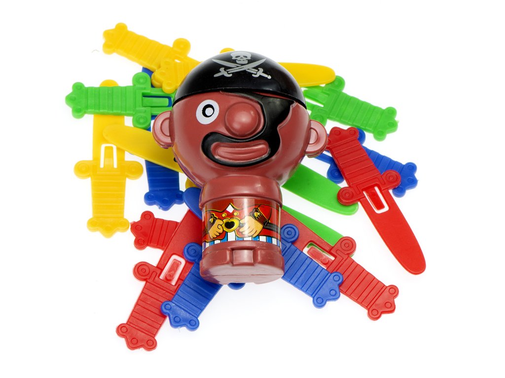 - Dávajte pozor, aby ste piráta nebodli. Ak je pirát bodnutý, meč vystrelí z hlavne ako prak.