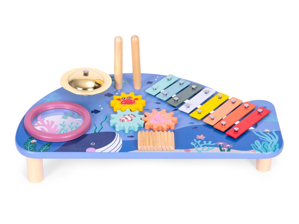ECOTOYS Drevený hudobný stolík – veľryba s 4 nástrojmi
