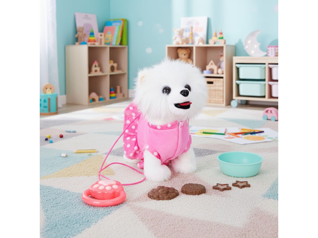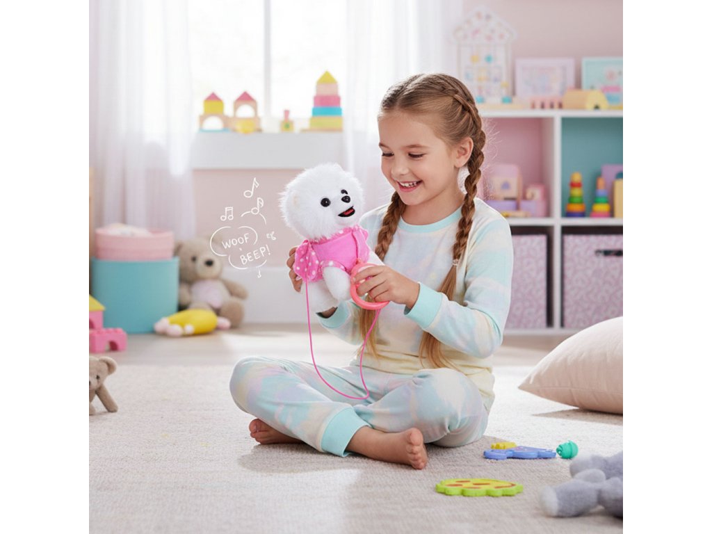 Každé dieťa chce mať svoje vlastné rozkošné zvieratko a interaktívny pes na vodítku túto úlohu dokonale plní a od prvej chvíle priťahuje pozornosť. Je to dokonalý kamarát na hranie, ktorý učí najmenšie deti, čo je to starostlivosť, odhodlanie a zodpovednosť. Vďaka realistickým reakciám - chôdzi, vrteniu chvostom a priateľským zvukom - sa dieťa prirodzene vžije do úlohy opatrovateľa, rozvíjanie empatie a vytváranie návykov každodennej starostlivosti. Priložené príslušenstvo, ako napríklad miska, jedlo a sušienky, inšpiruje k tvorivej hre a hranie rolí, a zároveň podporuje rozvoj manuálnych zručností.